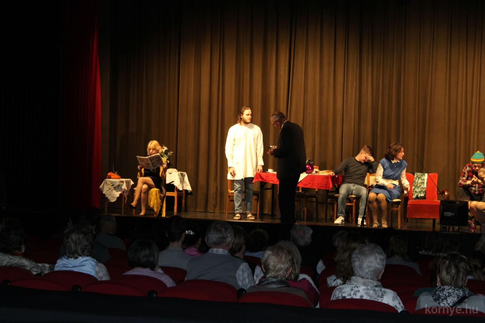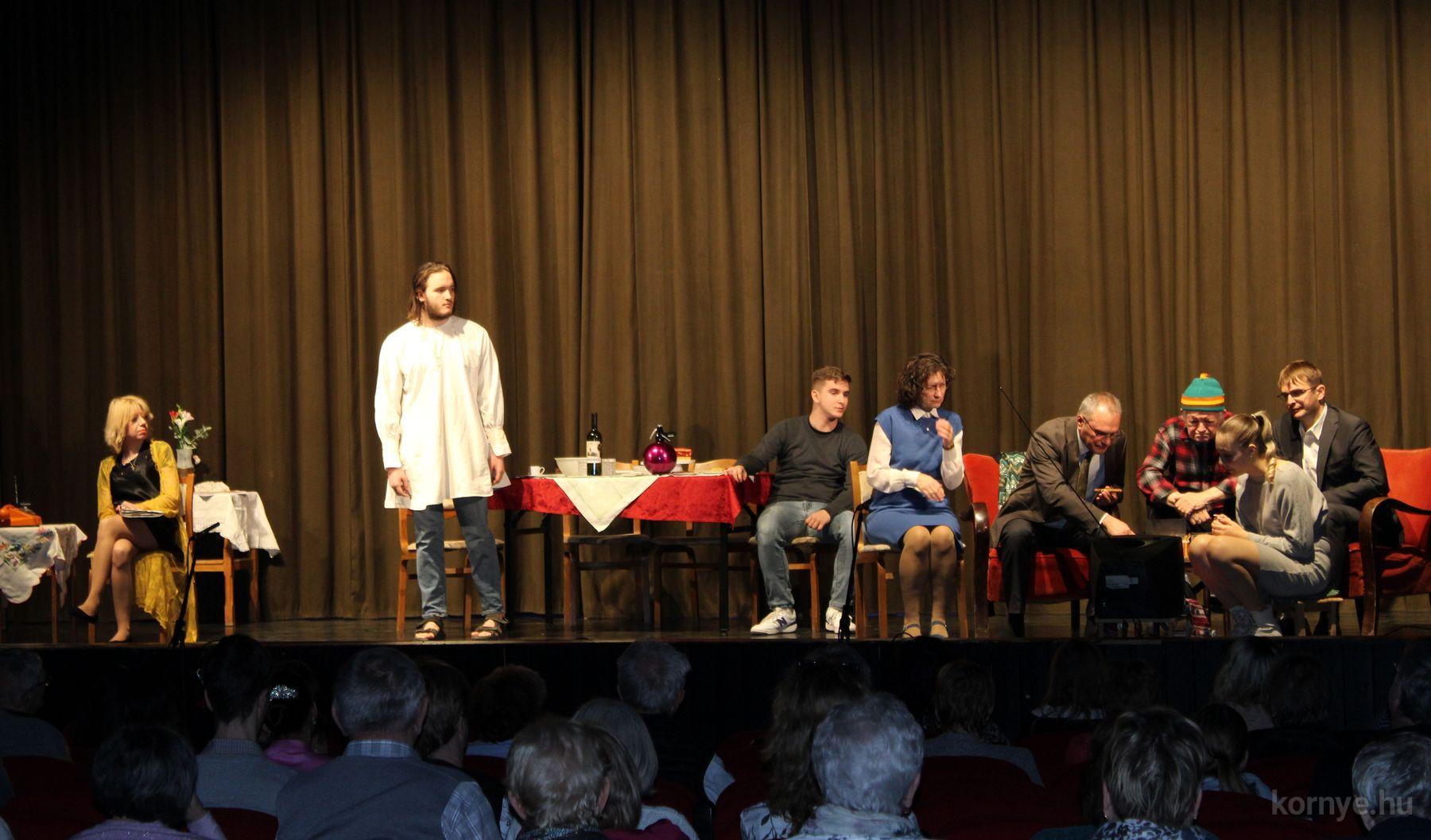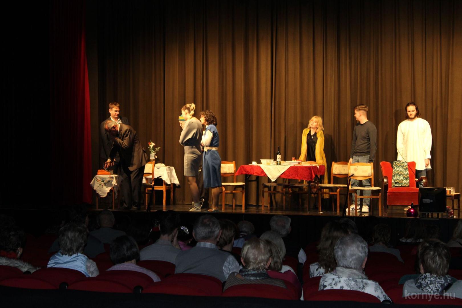 Ez a darab 1969-ben keletkezett, és azóta szinte valamennyi színház színpadát, sőt Európa jó néhány színpadát is megjárta. Merthogy nagyon aktuális. Műfaját Szakonyi Károly komédiának határozta meg, de én úgy gondolom, hogy inkább tragikomédia. Mert – meg fogják látni – bosszantóan nevetséges, ahogyan az emberek viselkednek a színpadon, és tragédia is, hiszen nagyon-nagyon a valóságból vette a helyzeteket, a figurákat, a párbeszédeket. Tulajdonképpen minden jó dráma kérdez valamit. Szakonyi Károly nagyon is aktuális, és most, Advent időszakában különösen az. A szerző azt kérdi tőlünk, hogy tudunk-e egymásra igazán figyelni? Nem felszínesek-e még a legközelebbi kapcsolataink is? És vesszük-e Istennek a jelzéseit, tudunk-e arra is gondolni, arra is figyelni, vagy csak verjük a mellünket, hogy mi aztán igazán hiszünk. Azt hiszem, hogy az előadás után azért hazavisznek valamennyien egy kis elgondolkodni valót, hiszen önmagunkkal szembesít bennünket – köszöntötte a vendégeket Bognár Istvánné, majd a következő két órában a szereplők a Bódog családhoz kalauzolták a nézőt, de – az eseményeket látva – szinte bármely mai család otthonába bekopogtathattunk volna. A történet szerint Bódogék a legkisebb fiuk, Imrus születésnapját ünneplik, de valójában senkit sem érdekel maga az ünnepelt, édesapja még azzal sincs tisztában, hogy 18, vagy 19 éves? A család tagjai leginkább a televízió előtt ülnek, mindenki beszél, de senki sem figyel a másikra. A darab egyik kulcsfigurája egy különös albérlő, Emberfi, aki Krisztus-szerű „figura”: csodákat tesz, vízből bort csinál, meggyógyítja a béna szomszédot, Szűcs urat, de Imruson kívül senki sem figyel rá.
