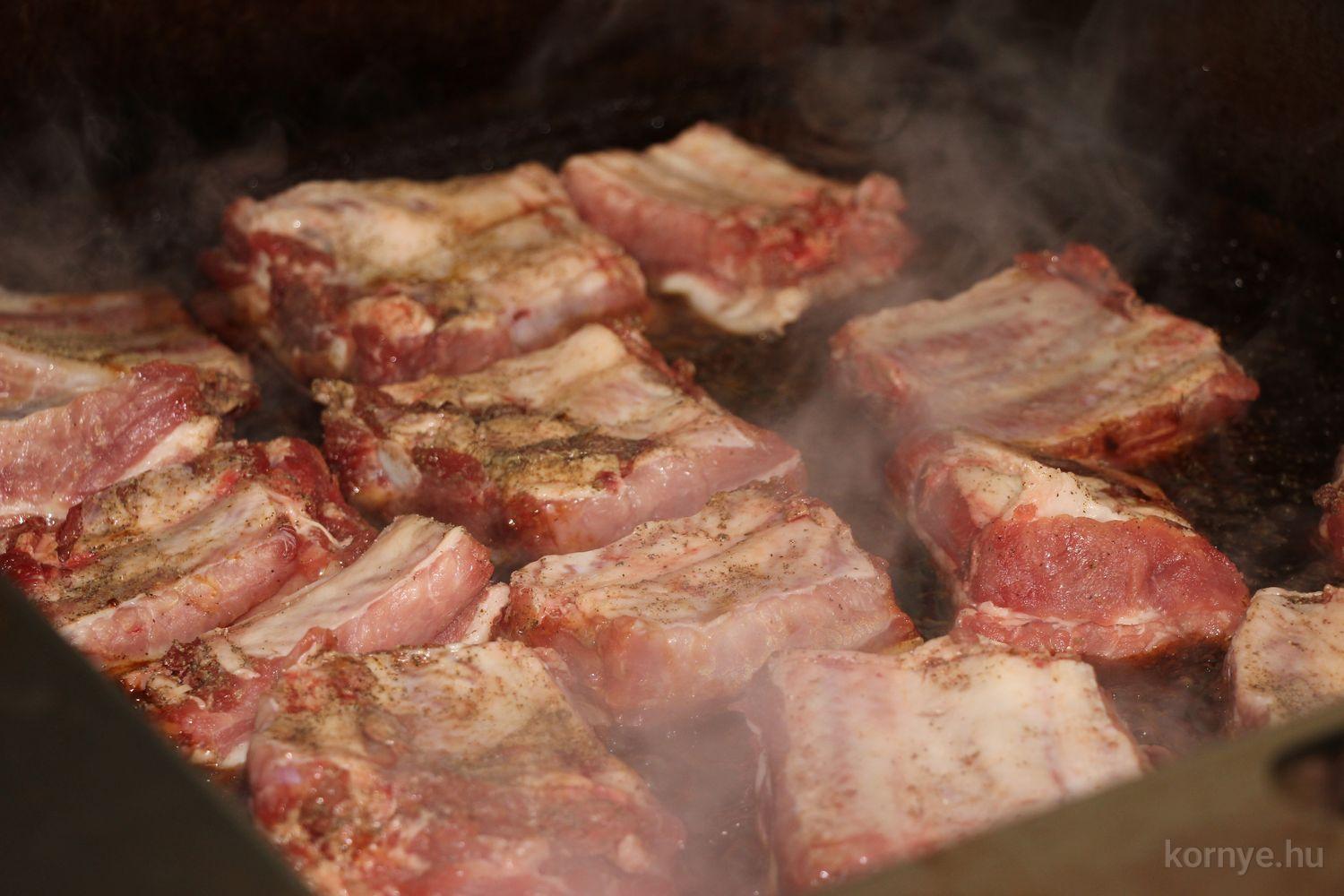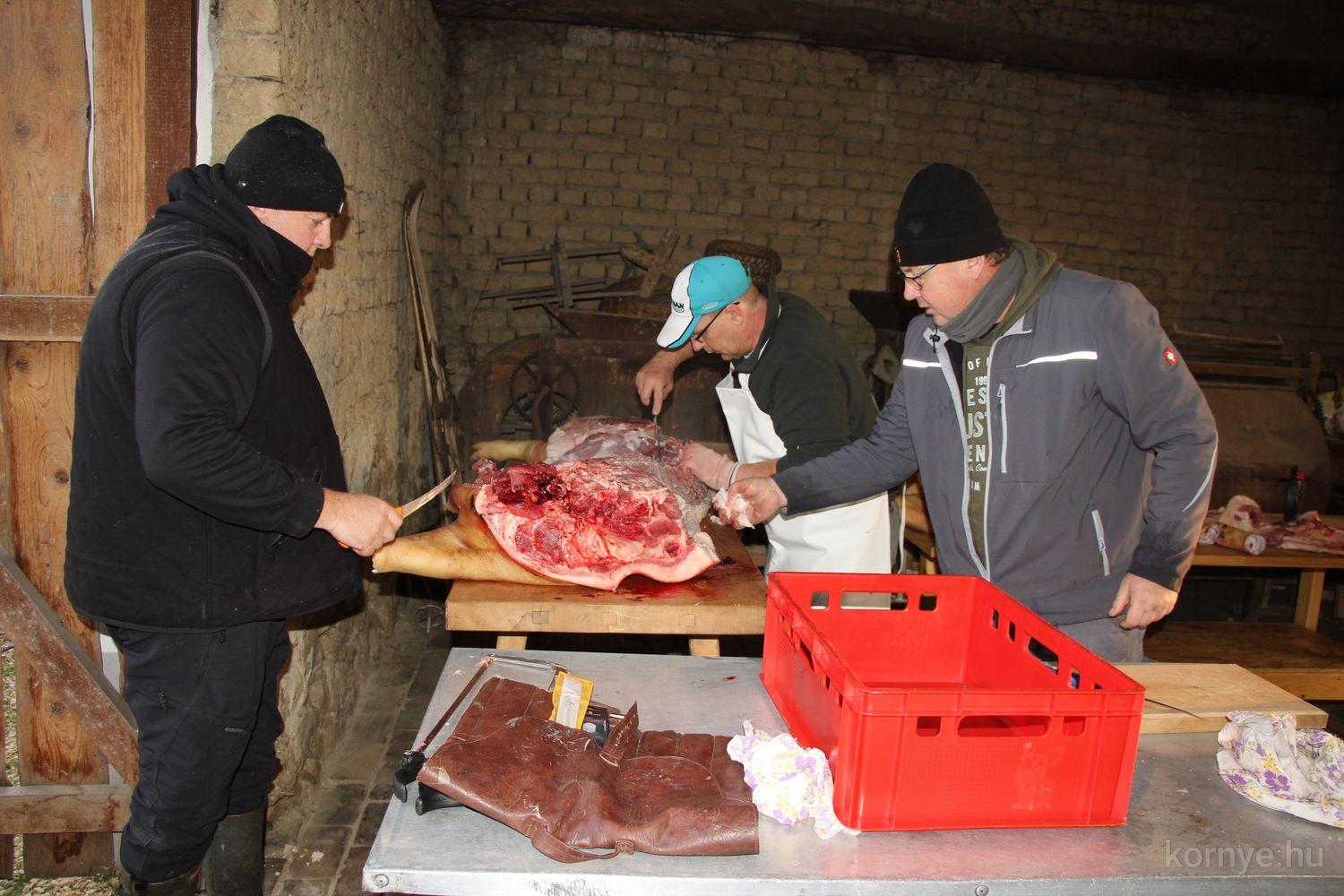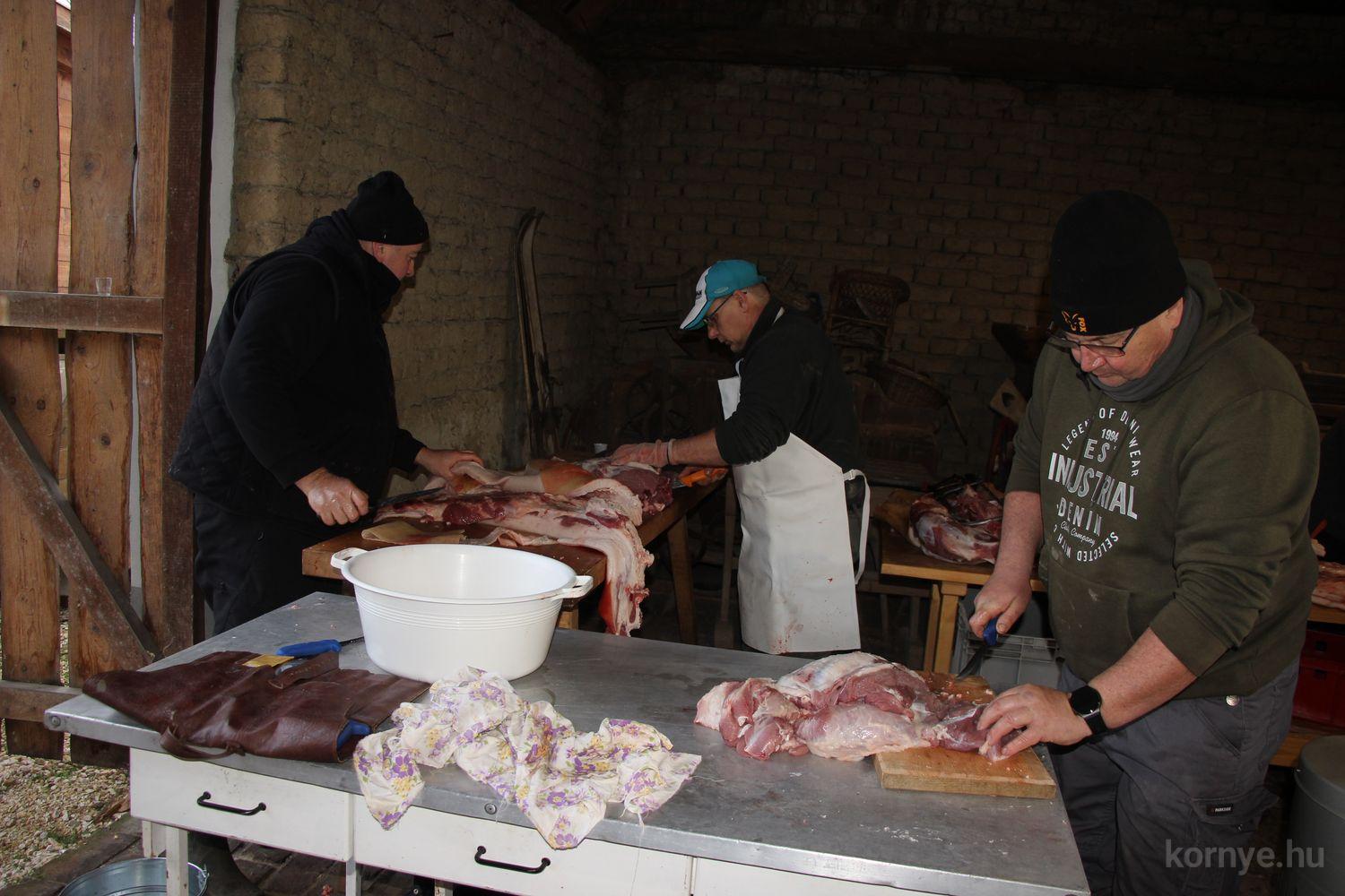 A Közösségi és Tájház udvarára hat óra körül érkezett meg az összességében 480 kilót nyomó két disznó. A kicsivel korábban megszúrt jószágokat sváb hagyományok szerint előbb forrázták, majd levakarták a szőrét, utána következett a perzselés, „mosdatás” és a végső tisztázás kefével, majd rémfára húzták, és hasították ketté.