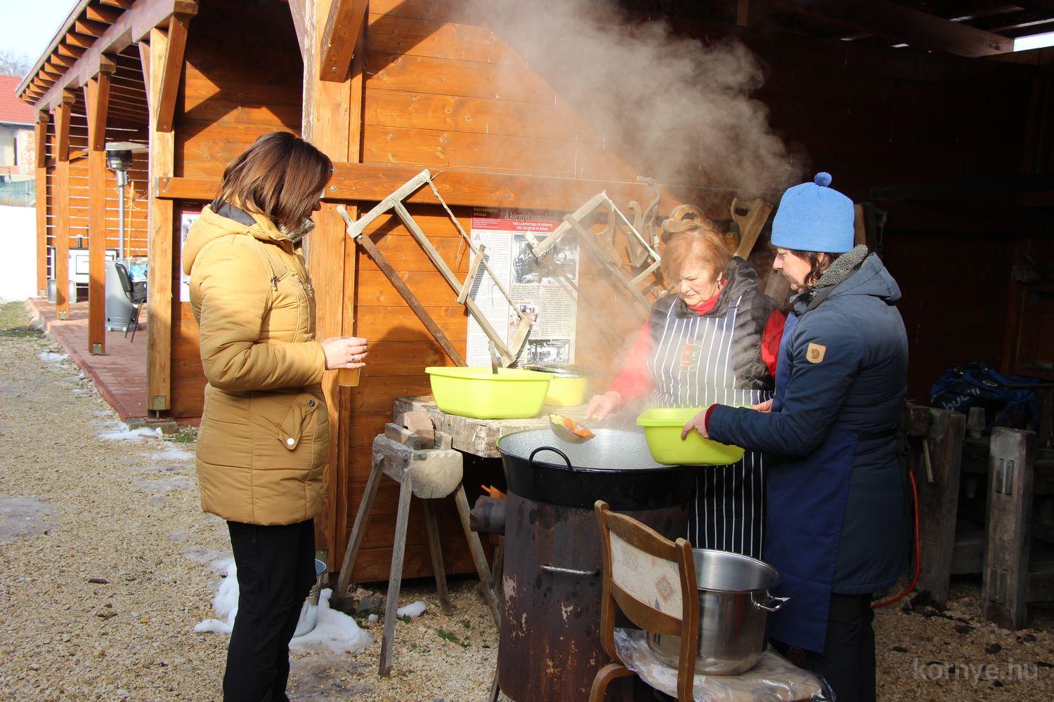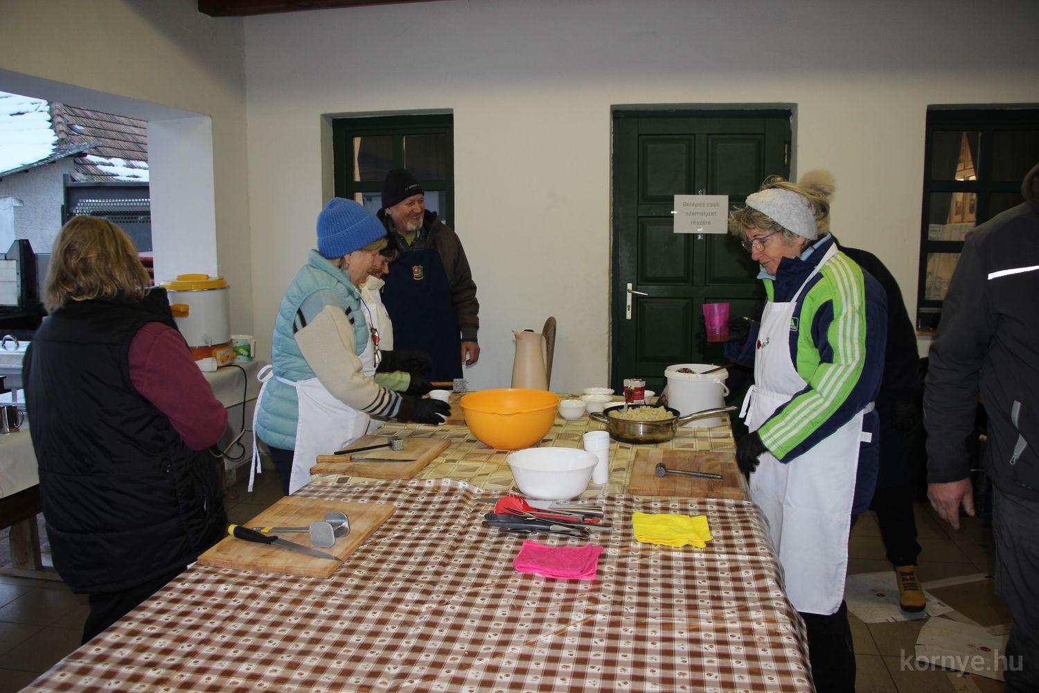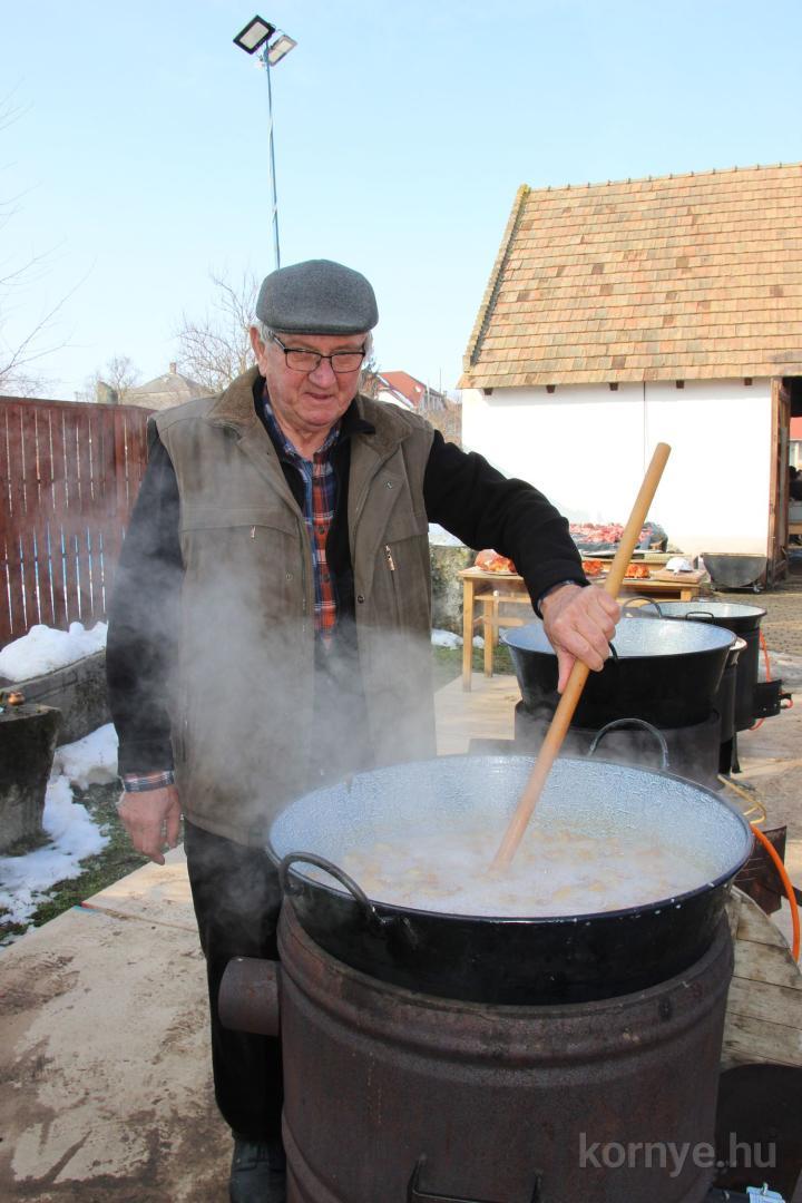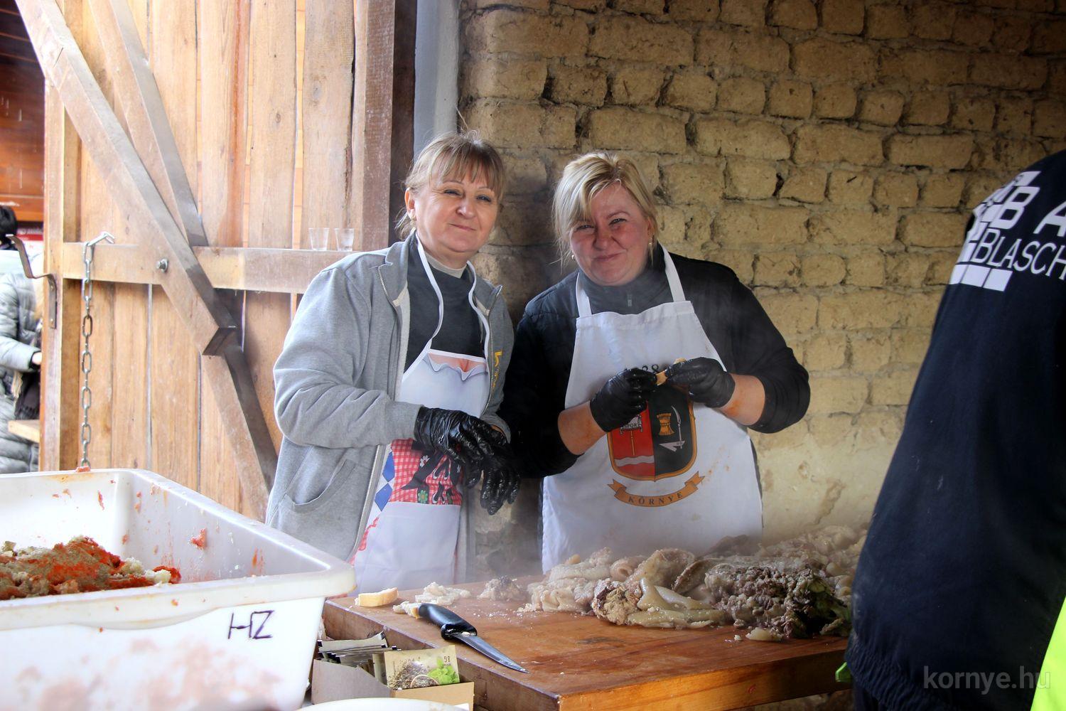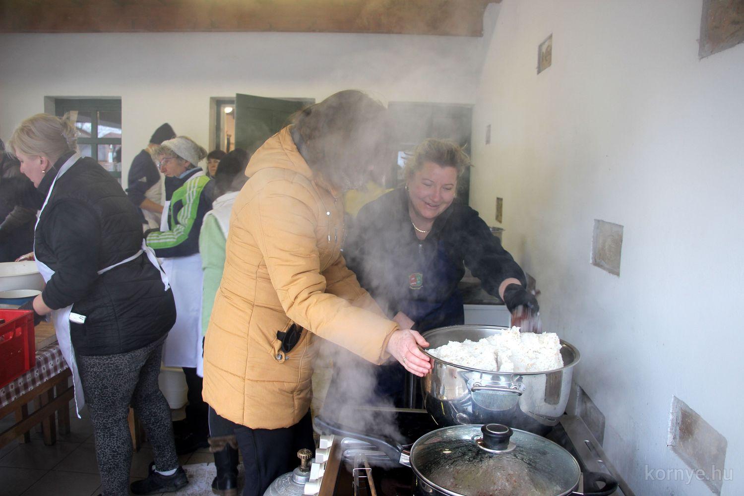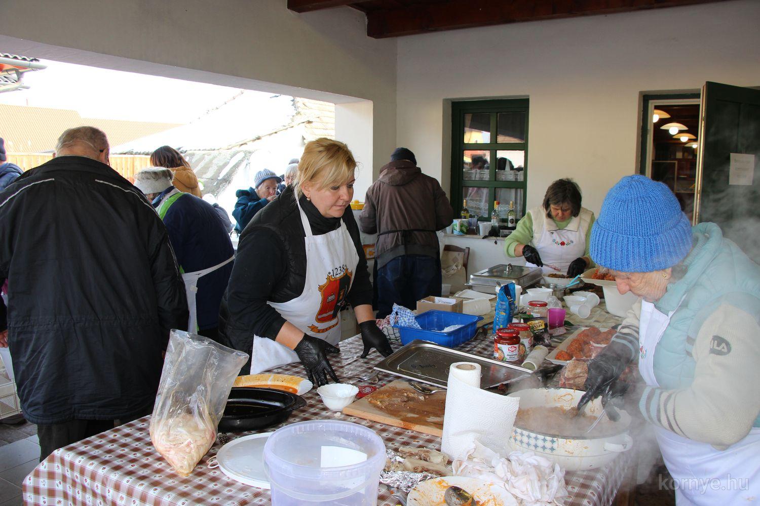 Mindeközben szorgoskodtak az asszonyok, akik már előző nap sütöttek: hájas lekvárost, töpörtyűs pogácsát, sörkiflit, kínáltak, s ahogy az lenni szokott, dolgoztak a férfikéz alá, készítették elő az alapanyagokat a majdani ízletes, sváb hagyományok szerinti disznótoros falatokhoz, melynek hírére 11 órától folyamatosan „telt házasnak” bizonyult a tájház udvara.