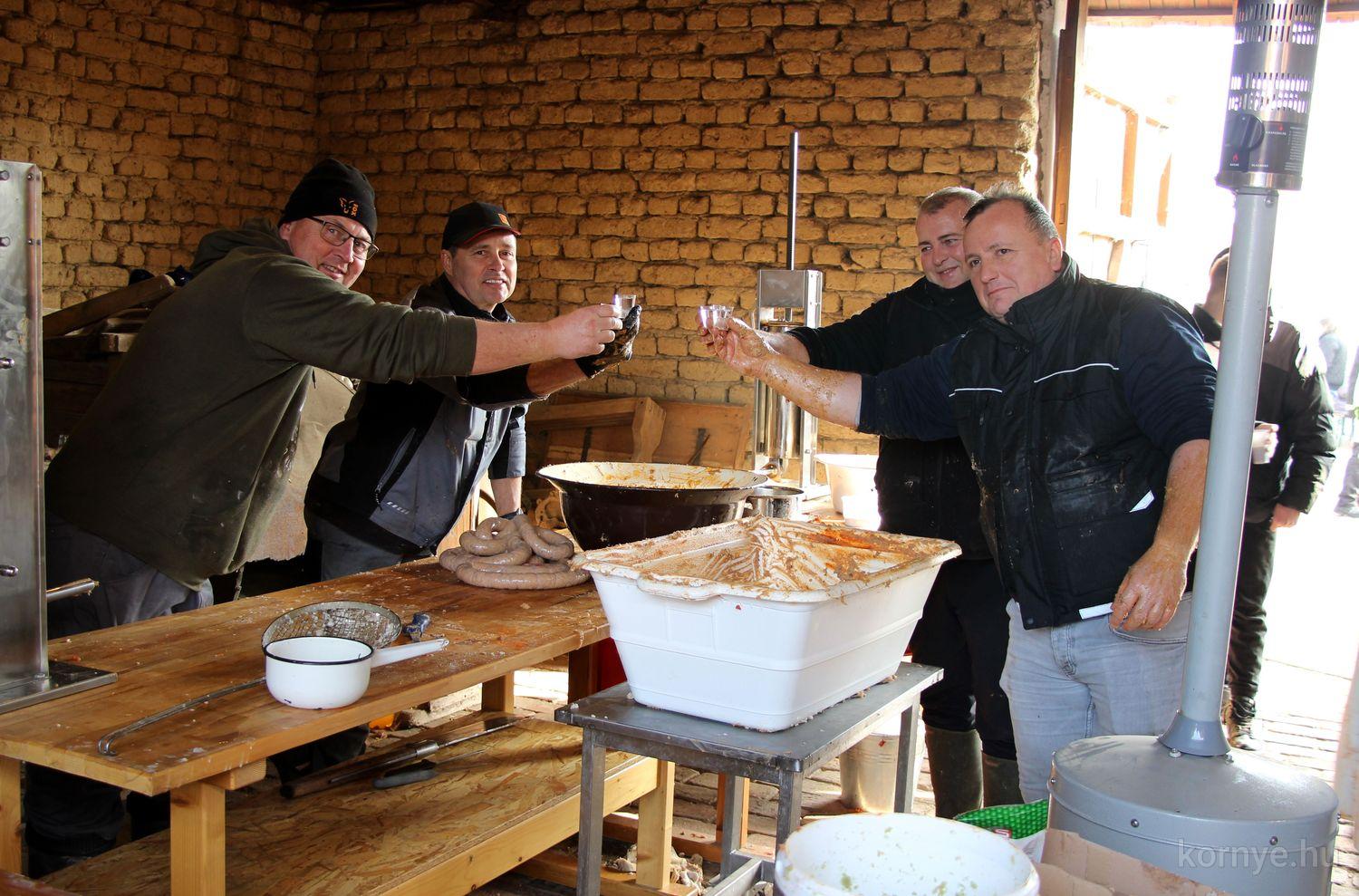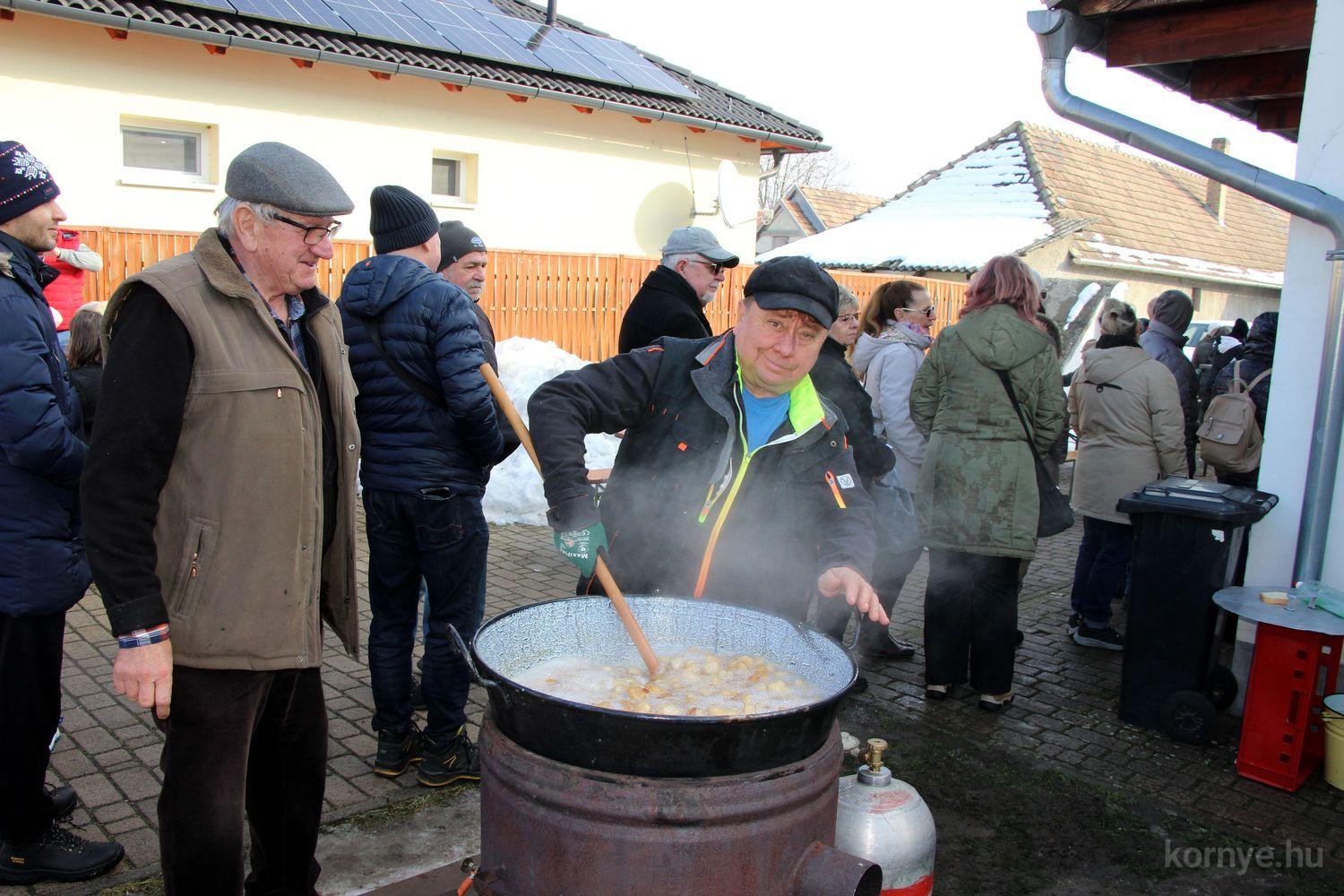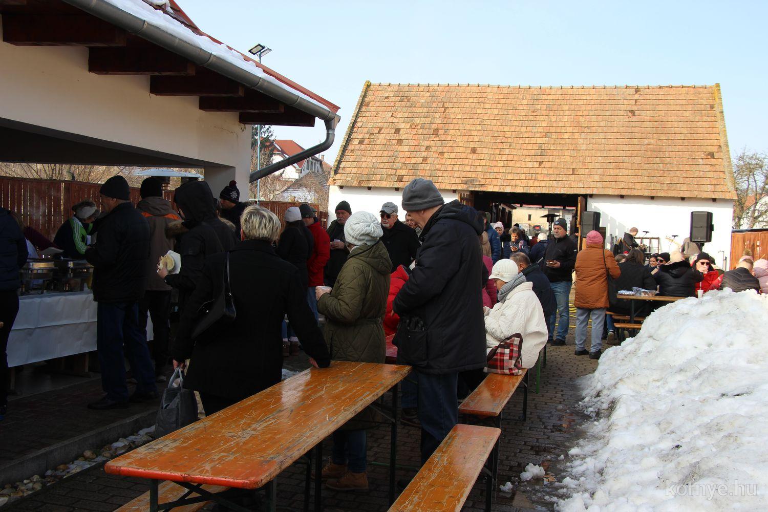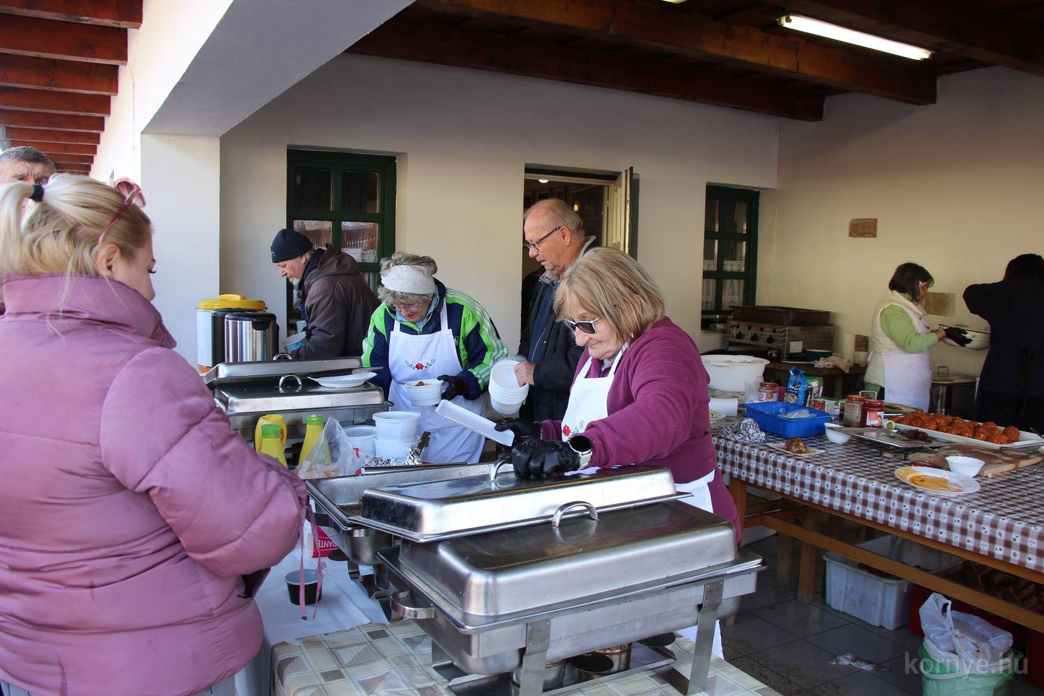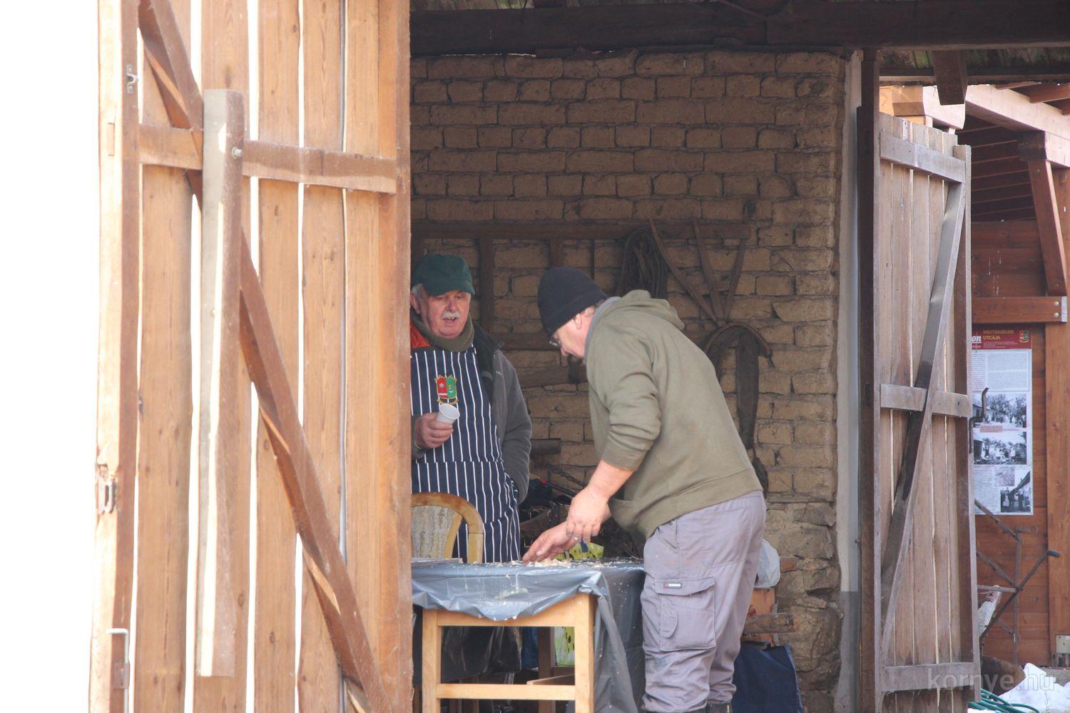 Mindeközben szorgoskodtak az asszonyok, akik már előző nap sütöttek: hájas lekvárost, töpörtyűs pogácsát, sörkiflit, kínáltak, s ahogy az lenni szokott, dolgoztak a férfikéz alá, készítették elő az alapanyagokat a majdani ízletes, sváb hagyományok szerinti disznótoros falatokhoz, melynek hírére 11 órától folyamatosan „telt házasnak” bizonyult a tájház udvara.