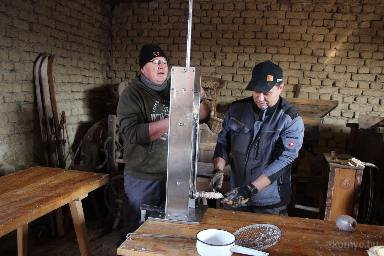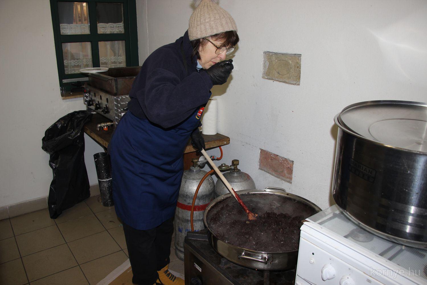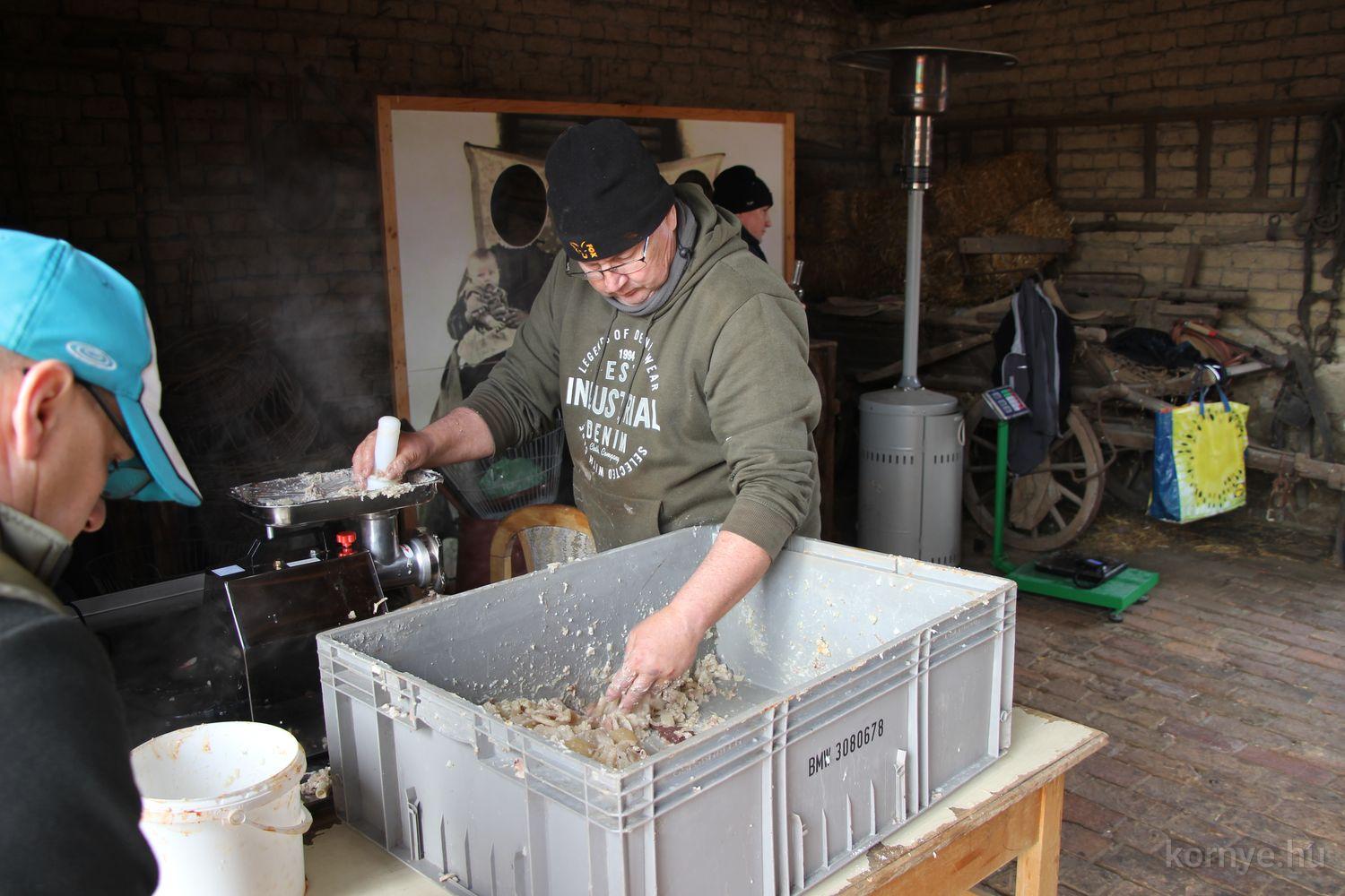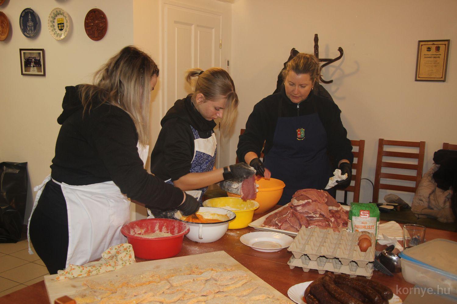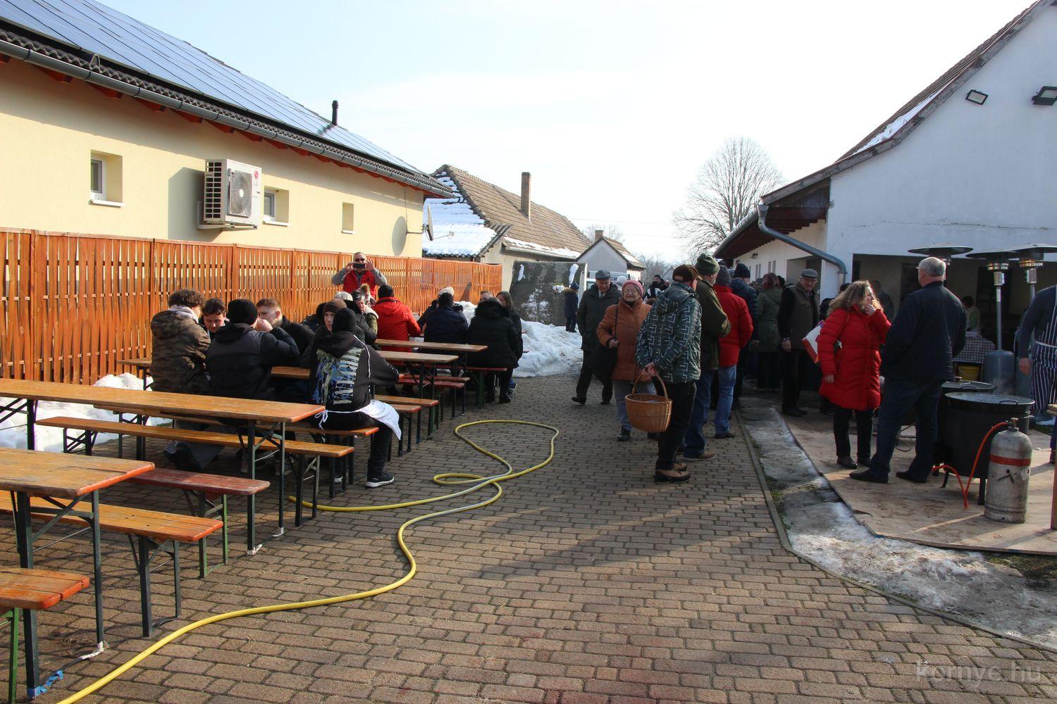 Mindeközben szorgoskodtak az asszonyok, akik már előző nap sütöttek: hájas lekvárost, töpörtyűs pogácsát, sörkiflit, kínáltak, s ahogy az lenni szokott, dolgoztak a férfikéz alá, készítették elő az alapanyagokat a majdani ízletes, sváb hagyományok szerinti disznótoros falatokhoz, melynek hírére 11 órától folyamatosan „telt házasnak” bizonyult a tájház udvara.