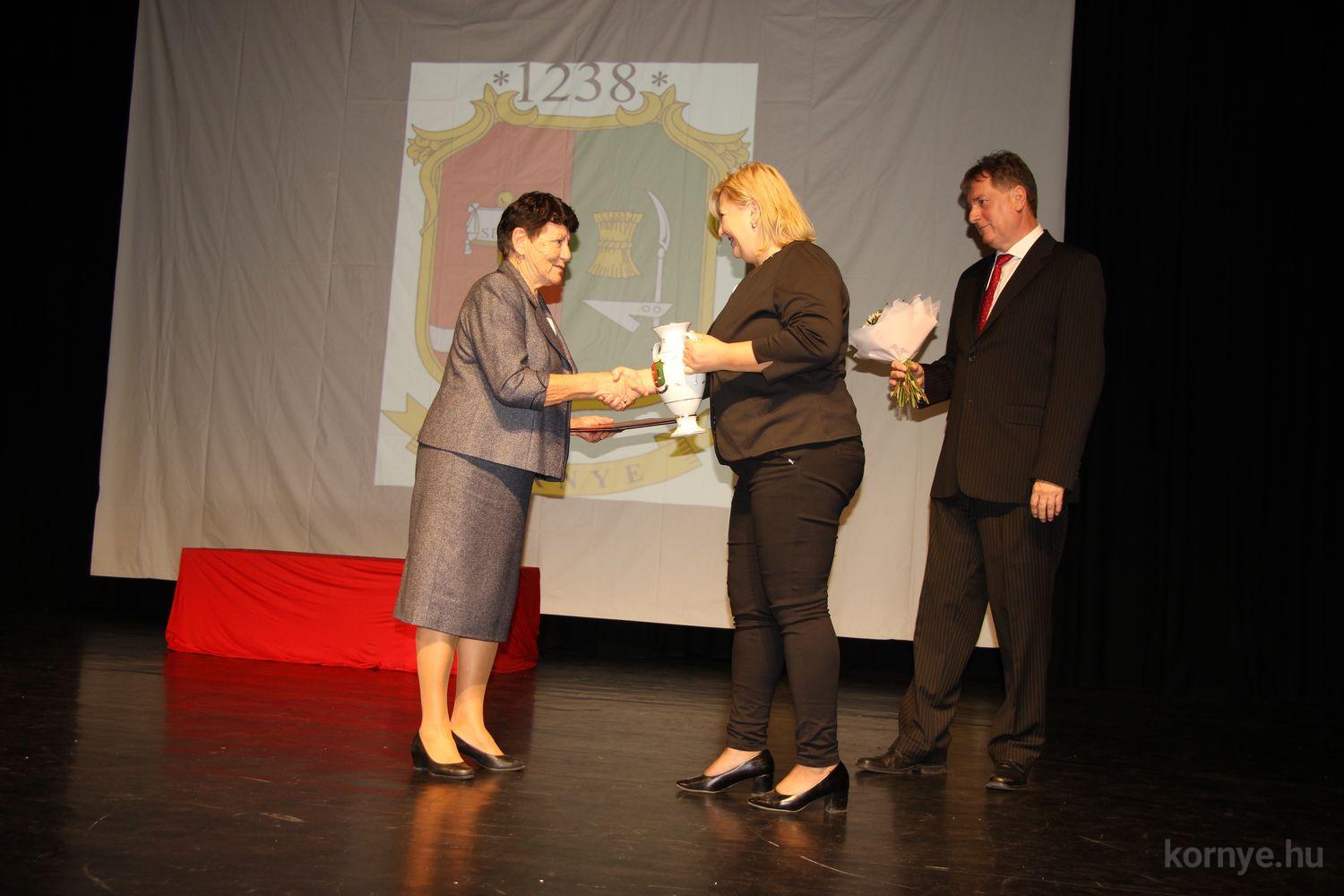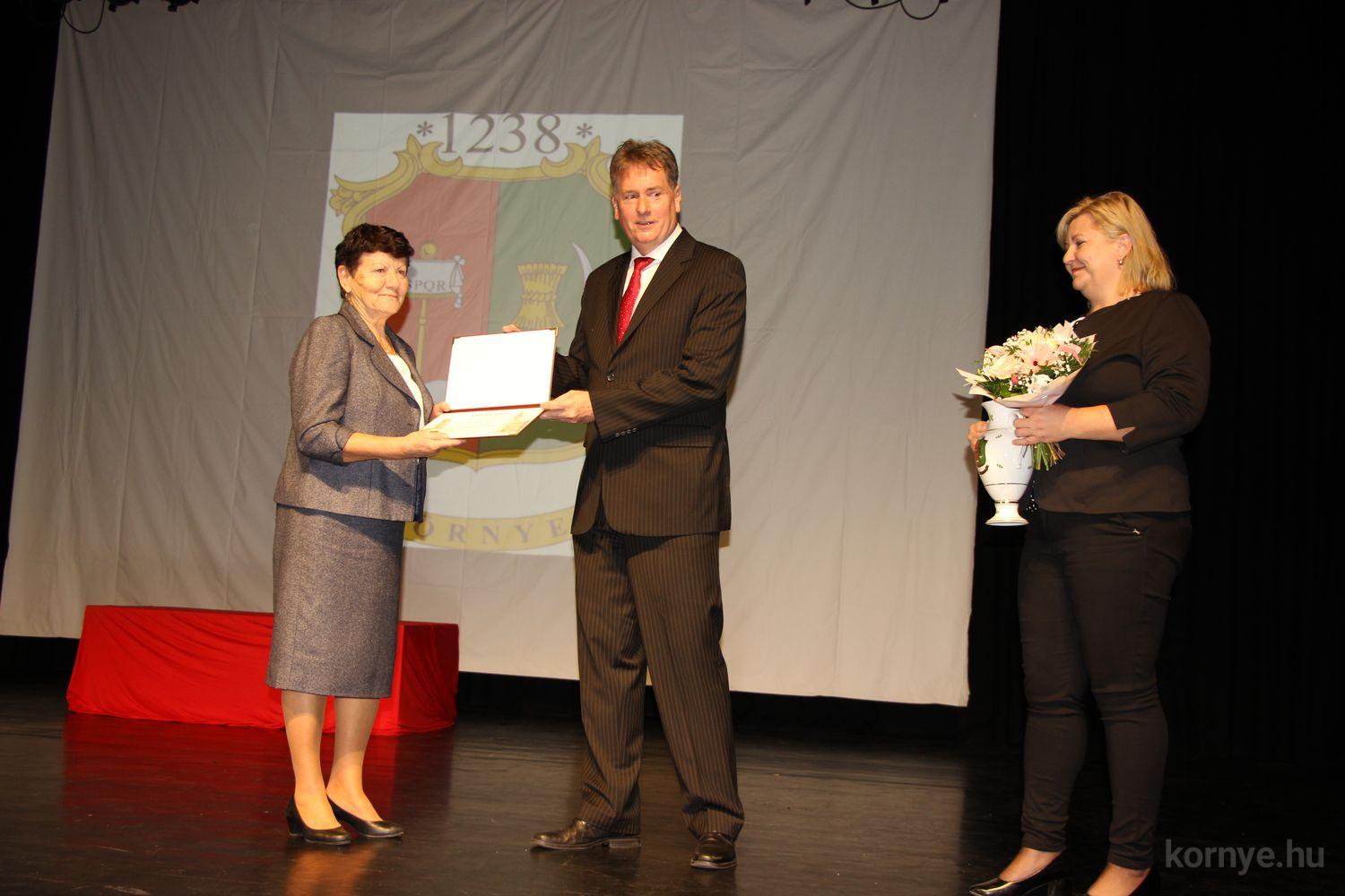 Az ünnepségen rendhagyó módon díjátadásra is sor került, mivel az augusztus 20-ai ünnepségen egyéb elfoglaltsága miatt nem lehetett jelen, és nem vehette át a számára megítélt díjat Dr. Tar Edit, községünk ismert, megbecsült polgára, aki számtalan mozgásszervi problémával küszködő környeinek is segített az eltelt 35 év alatt, és nyugdíjasként is aktívan folytatja a gyógyító munkát. Környe Község Önkormányzata a község egészségügyi ellátása érdekében kifejtett magas színvonalú munkájának elismeréseként Dr. Tar Editnek a „Közegészségügyi díjat” adományozta, az elismerést Beke László polgármester és Tirhold Kármen alpolgármester adta át.