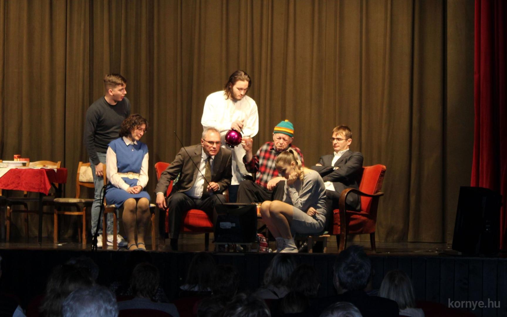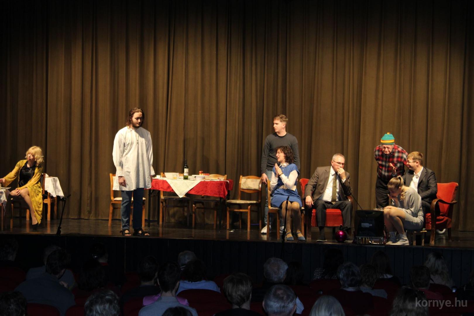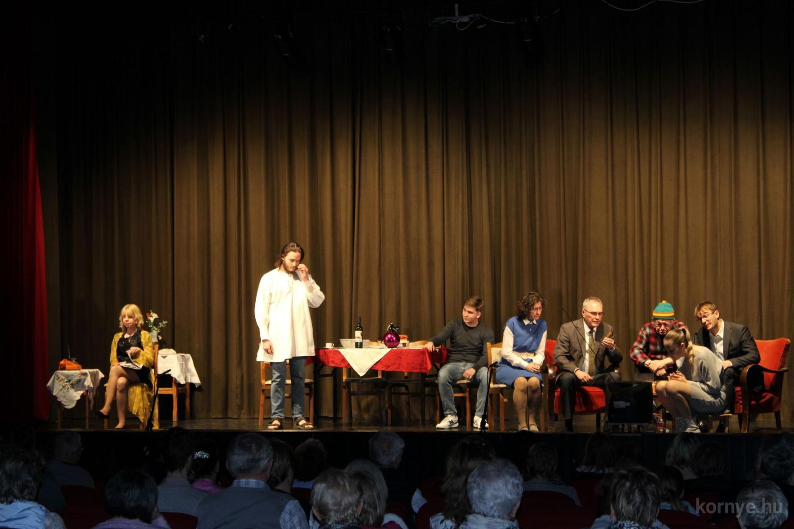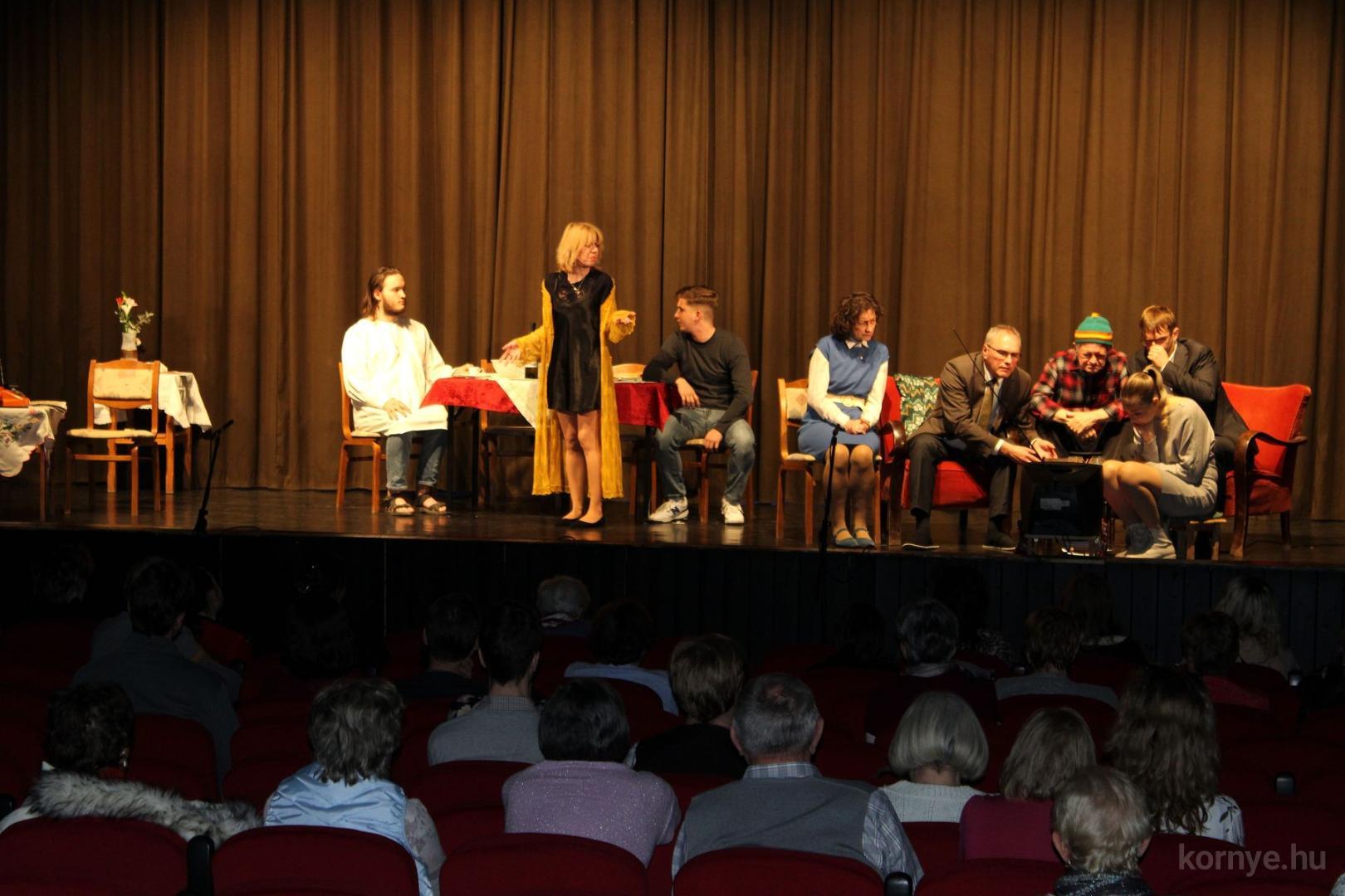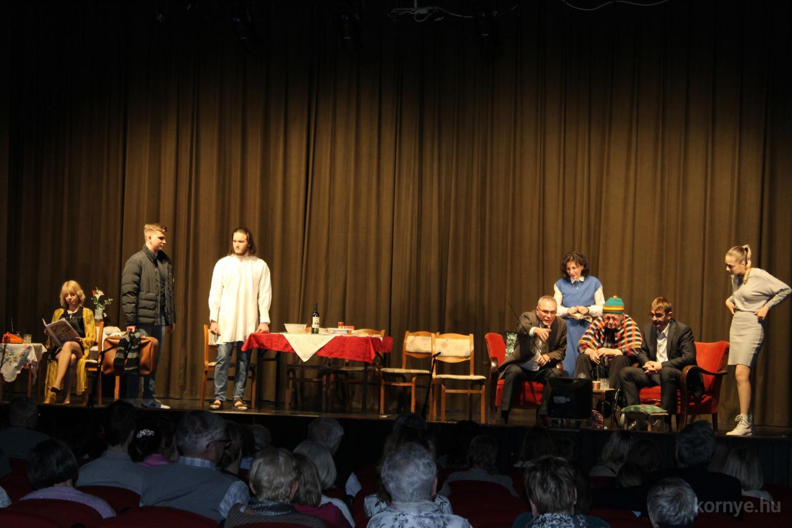 Ez a darab 1969-ben keletkezett, és azóta szinte valamennyi színház színpadát, sőt Európa jó néhány színpadát is megjárta. Merthogy nagyon aktuális. Műfaját Szakonyi Károly komédiának határozta meg, de én úgy gondolom, hogy inkább tragikomédia. Mert – meg fogják látni – bosszantóan nevetséges, ahogyan az emberek viselkednek a színpadon, és tragédia is, hiszen nagyon-nagyon a valóságból vette a helyzeteket, a figurákat, a párbeszédeket. Tulajdonképpen minden jó dráma kérdez valamit. Szakonyi Károly nagyon is aktuális, és most, Advent időszakában különösen az. A szerző azt kérdi tőlünk, hogy tudunk-e egymásra igazán figyelni? Nem felszínesek-e még a legközelebbi kapcsolataink is? És vesszük-e Istennek a jelzéseit, tudunk-e arra is gondolni, arra is figyelni, vagy csak verjük a mellünket, hogy mi aztán igazán hiszünk. Azt hiszem, hogy az előadás után azért hazavisznek valamennyien egy kis elgondolkodni valót, hiszen önmagunkkal szembesít bennünket – köszöntötte a vendégeket Bognár Istvánné, majd a következő két órában a szereplők a Bódog családhoz kalauzolták a nézőt, de – az eseményeket látva – szinte bármely mai család otthonába bekopogtathattunk volna. A történet szerint Bódogék a legkisebb fiuk, Imrus születésnapját ünneplik, de valójában senkit sem érdekel maga az ünnepelt, édesapja még azzal sincs tisztában, hogy 18, vagy 19 éves? A család tagjai leginkább a televízió előtt ülnek, mindenki beszél, de senki sem figyel a másikra. A darab egyik kulcsfigurája egy különös albérlő, Emberfi, aki Krisztus-szerű „figura”: csodákat tesz, vízből bort csinál, meggyógyítja a béna szomszédot, Szűcs urat, de Imruson kívül senki sem figyel rá.