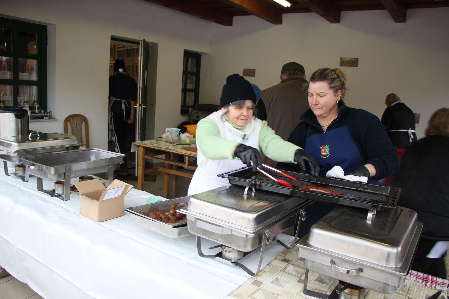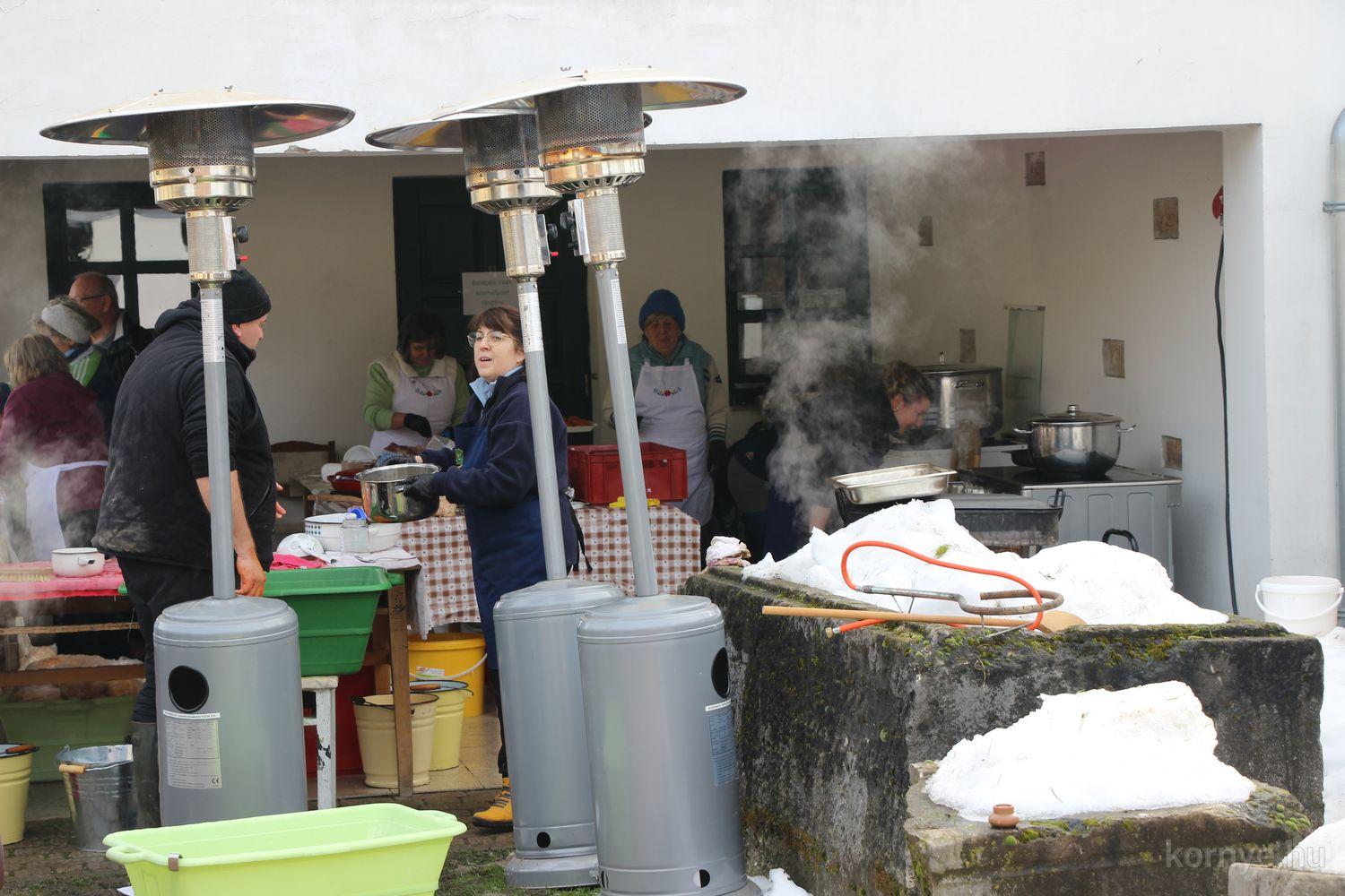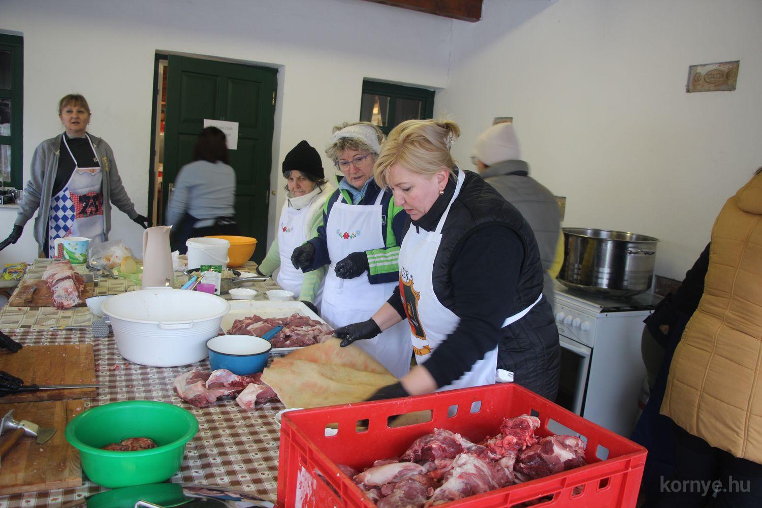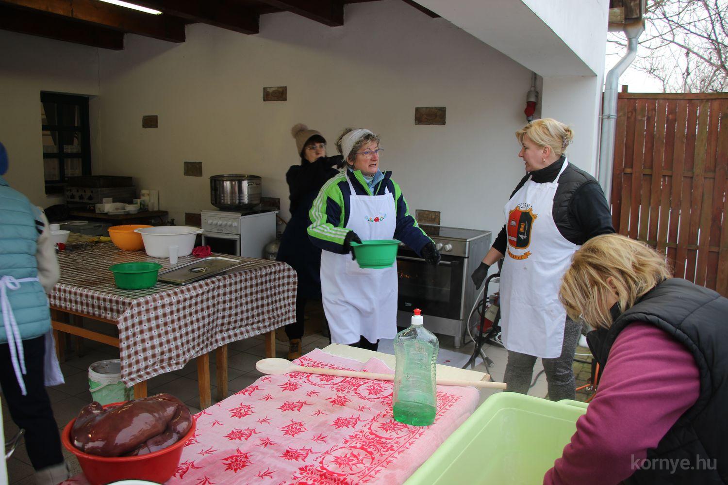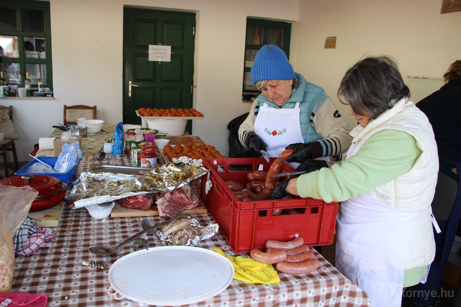 Mindeközben szorgoskodtak az asszonyok, akik már előző nap sütöttek: hájas lekvárost, töpörtyűs pogácsát, sörkiflit, kínáltak, s ahogy az lenni szokott, dolgoztak a férfikéz alá, készítették elő az alapanyagokat a majdani ízletes, sváb hagyományok szerinti disznótoros falatokhoz, melynek hírére 11 órától folyamatosan „telt házasnak” bizonyult a tájház udvara.