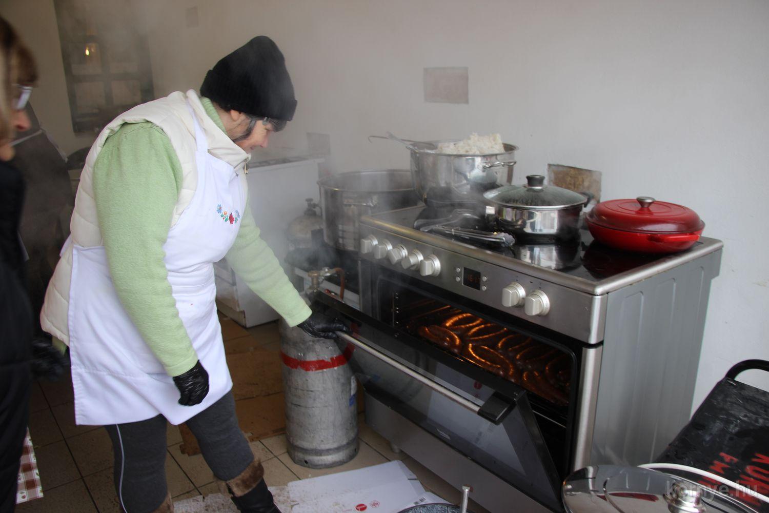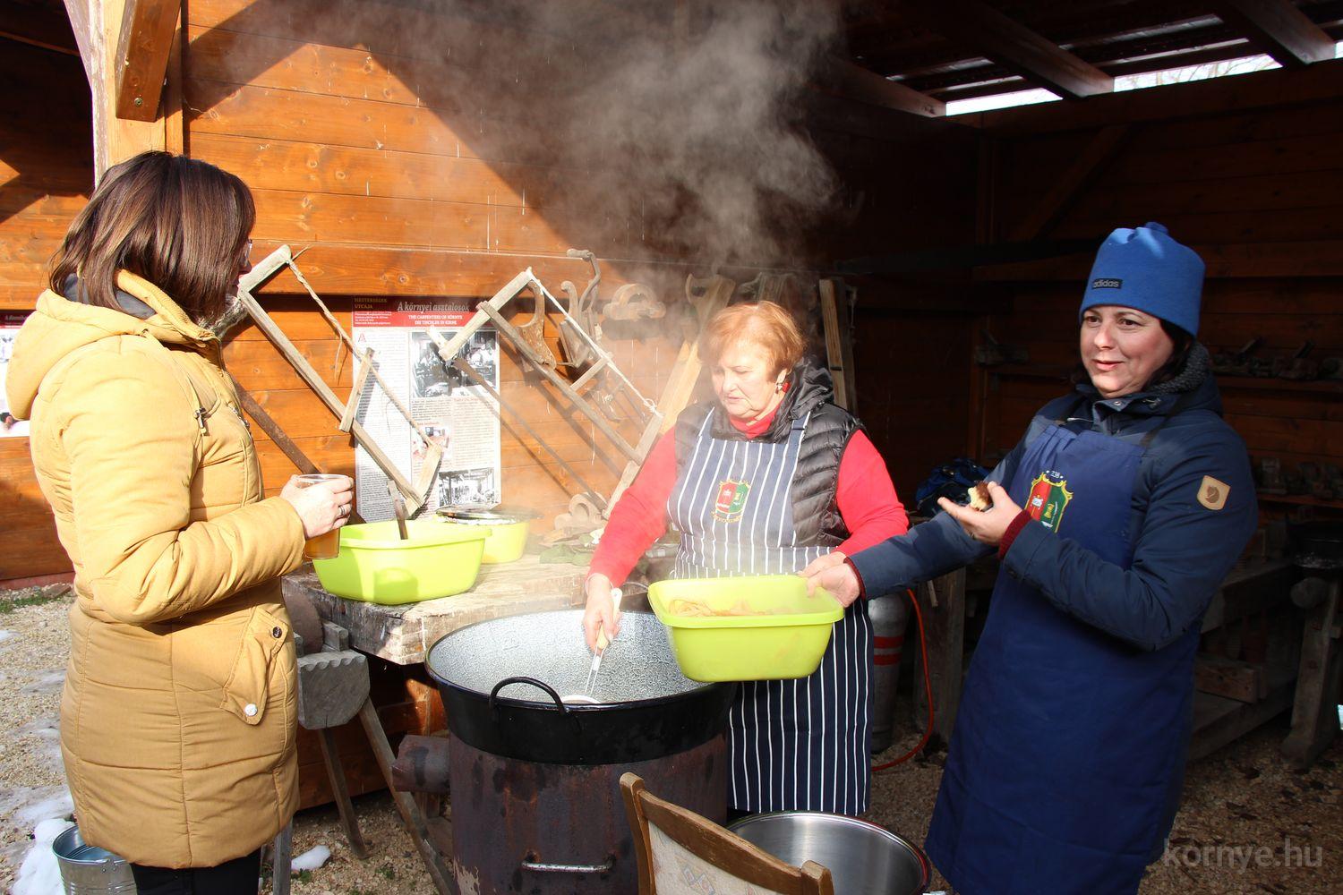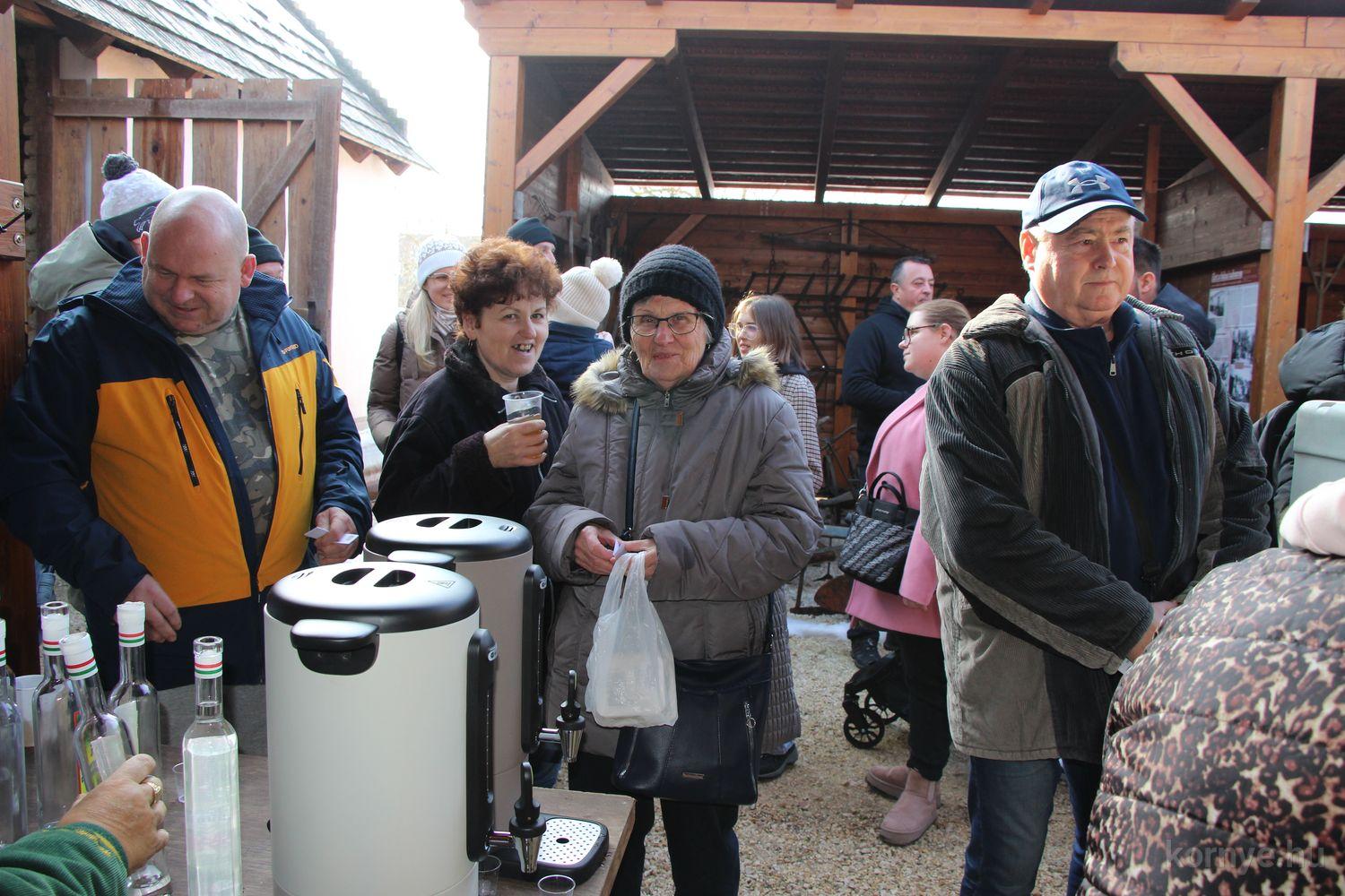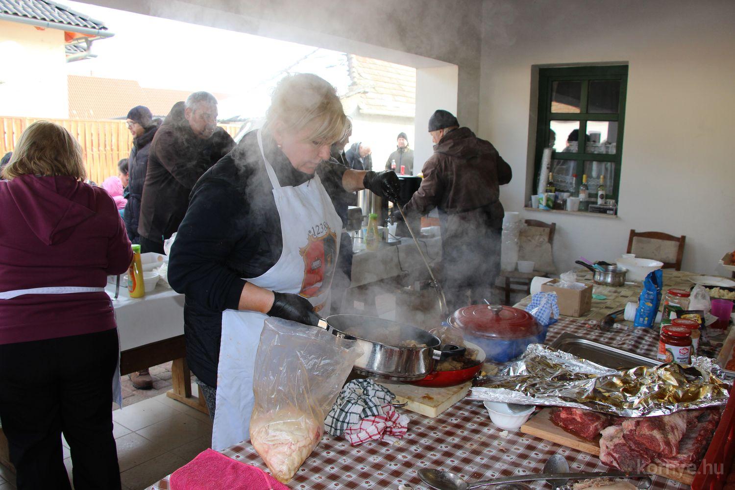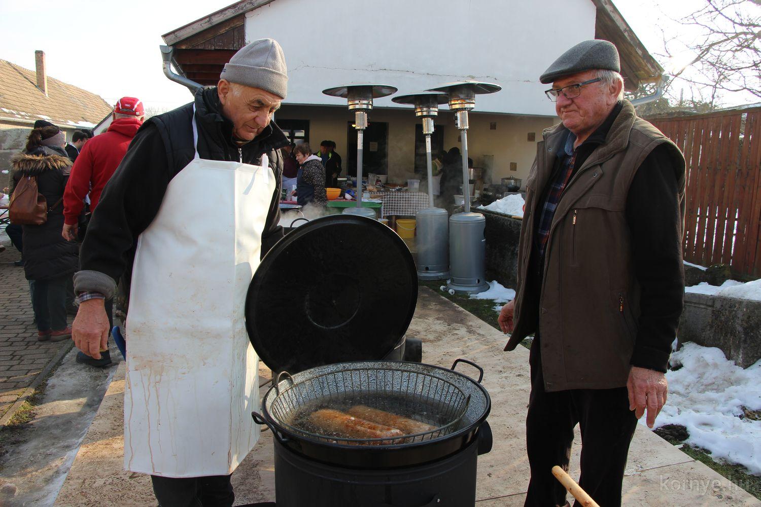Mindeközben szorgoskodtak az asszonyok, akik már előző nap sütöttek: hájas lekvárost, töpörtyűs pogácsát, sörkiflit, kínáltak, s ahogy az lenni szokott, dolgoztak a férfikéz alá, készítették elő az alapanyagokat a majdani ízletes, sváb hagyományok szerinti disznótoros falatokhoz, melynek hírére 11 órától folyamatosan „telt házasnak” bizonyult a tájház udvara.