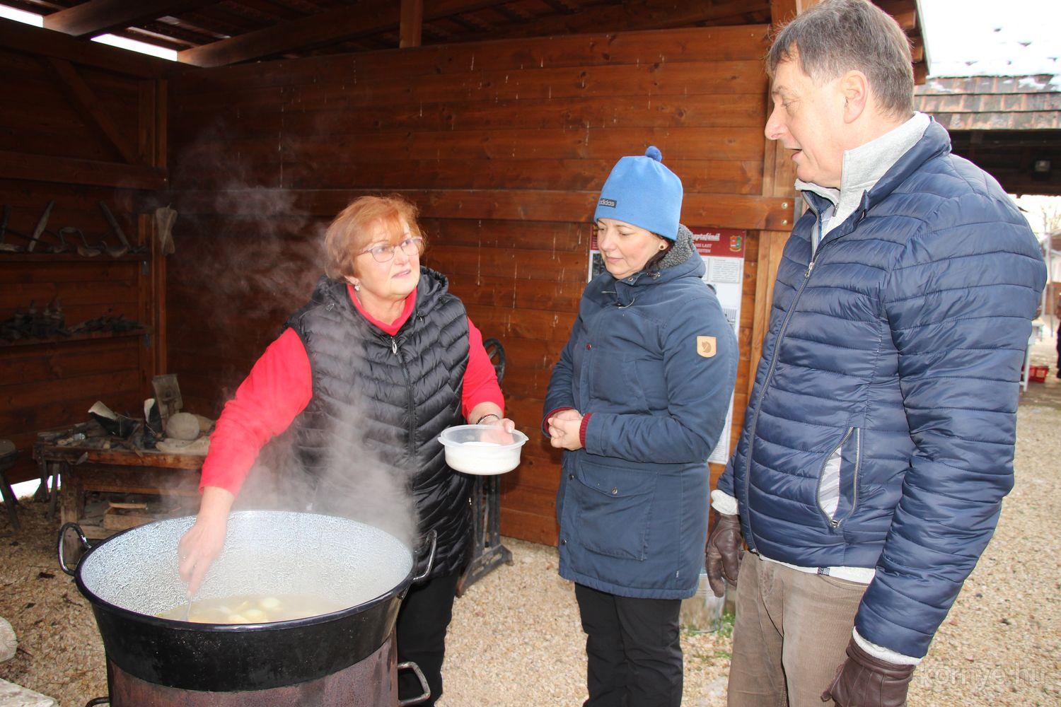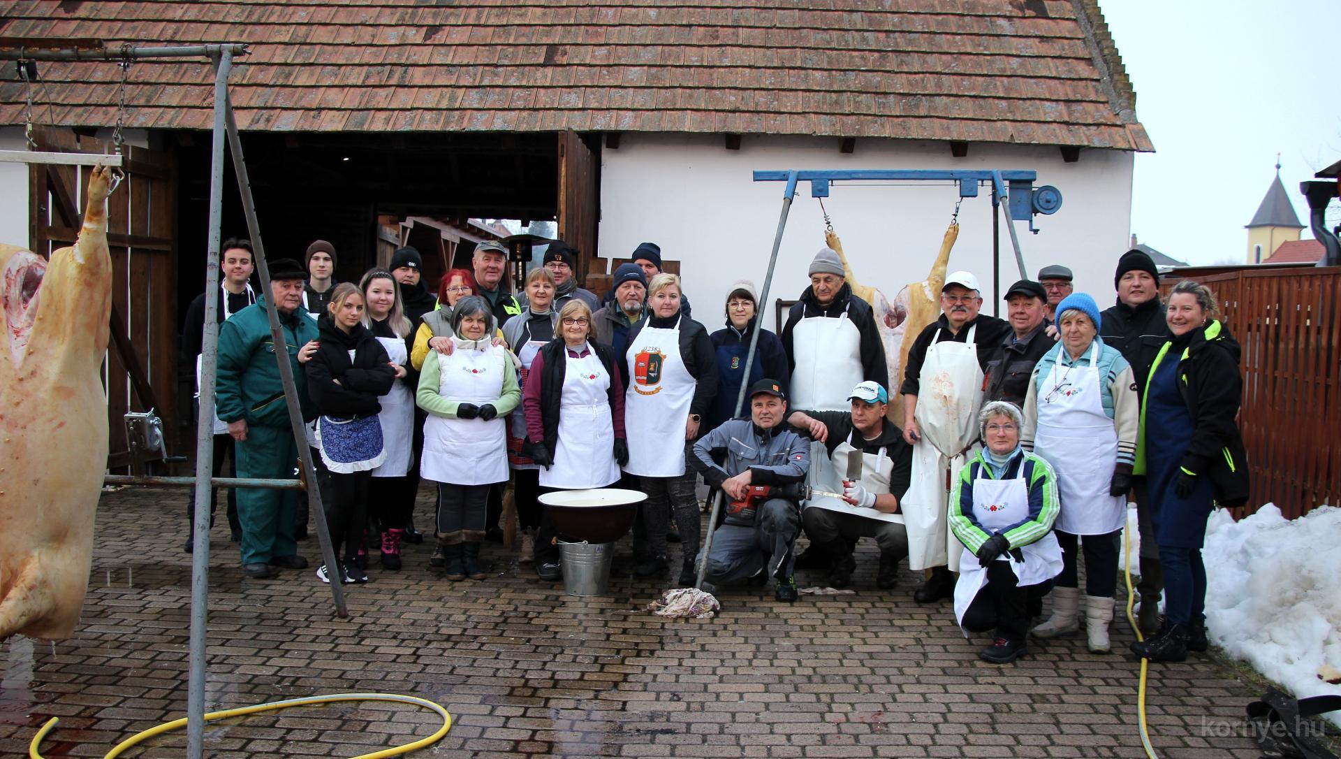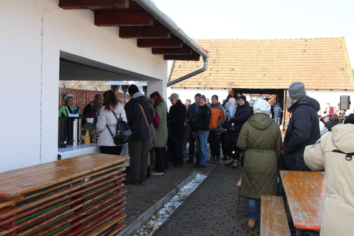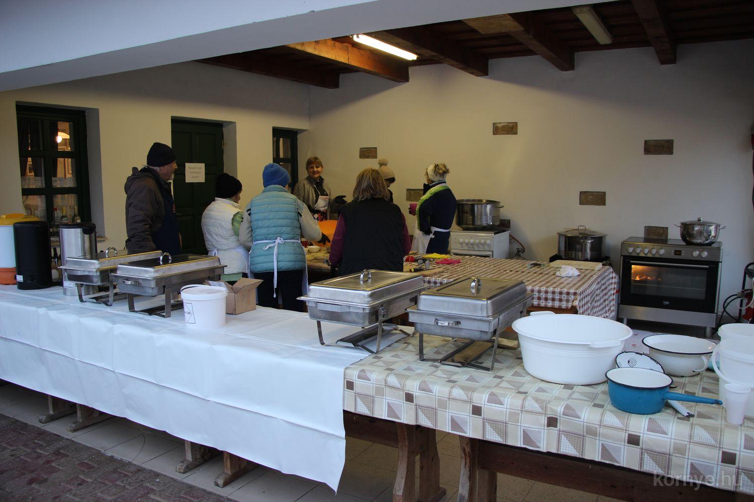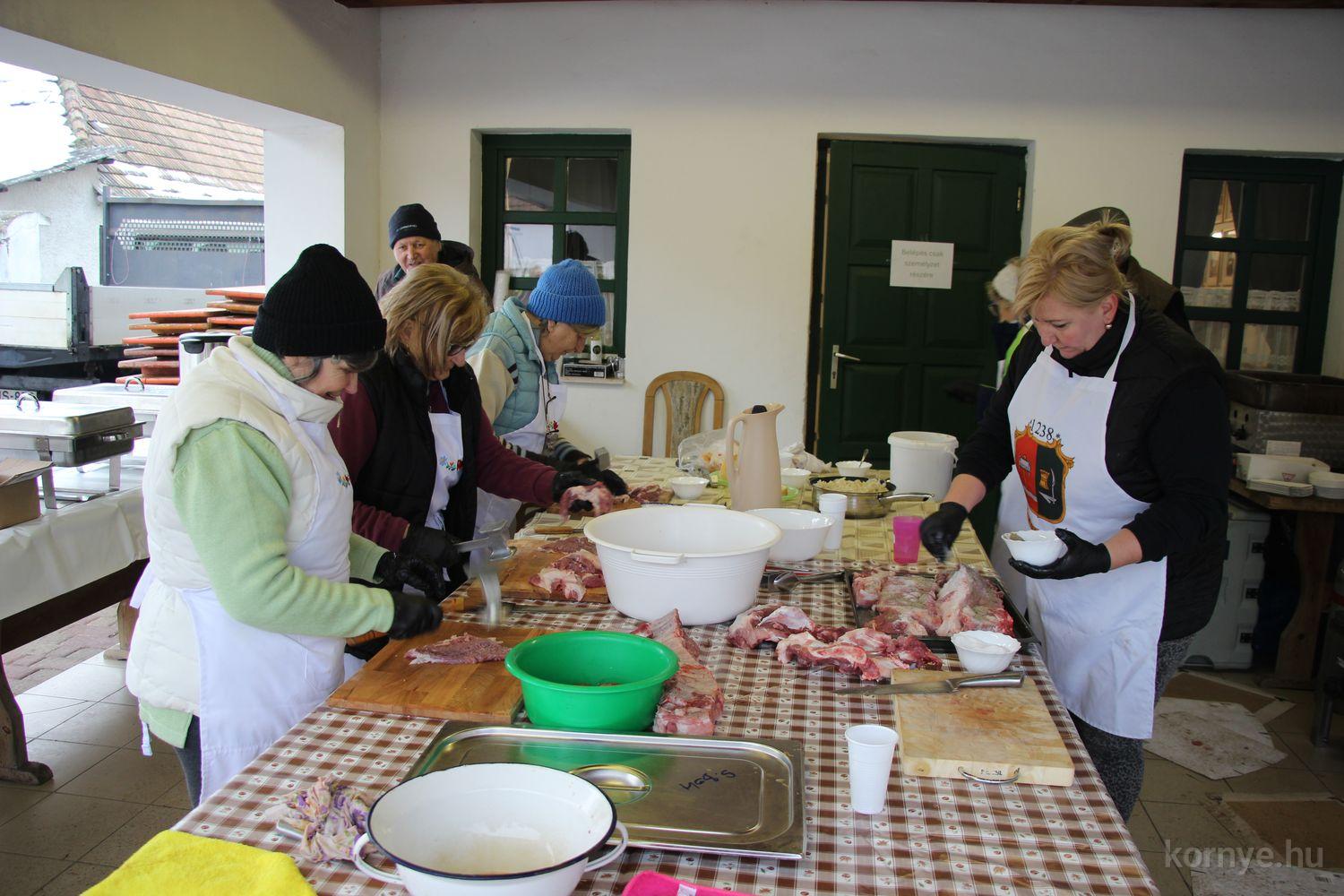 Mindeközben szorgoskodtak az asszonyok, akik már előző nap sütöttek: hájas lekvárost, töpörtyűs pogácsát, sörkiflit, kínáltak, s ahogy az lenni szokott, dolgoztak a férfikéz alá, készítették elő az alapanyagokat a majdani ízletes, sváb hagyományok szerinti disznótoros falatokhoz, melynek hírére 11 órától folyamatosan „telt házasnak” bizonyult a tájház udvara.