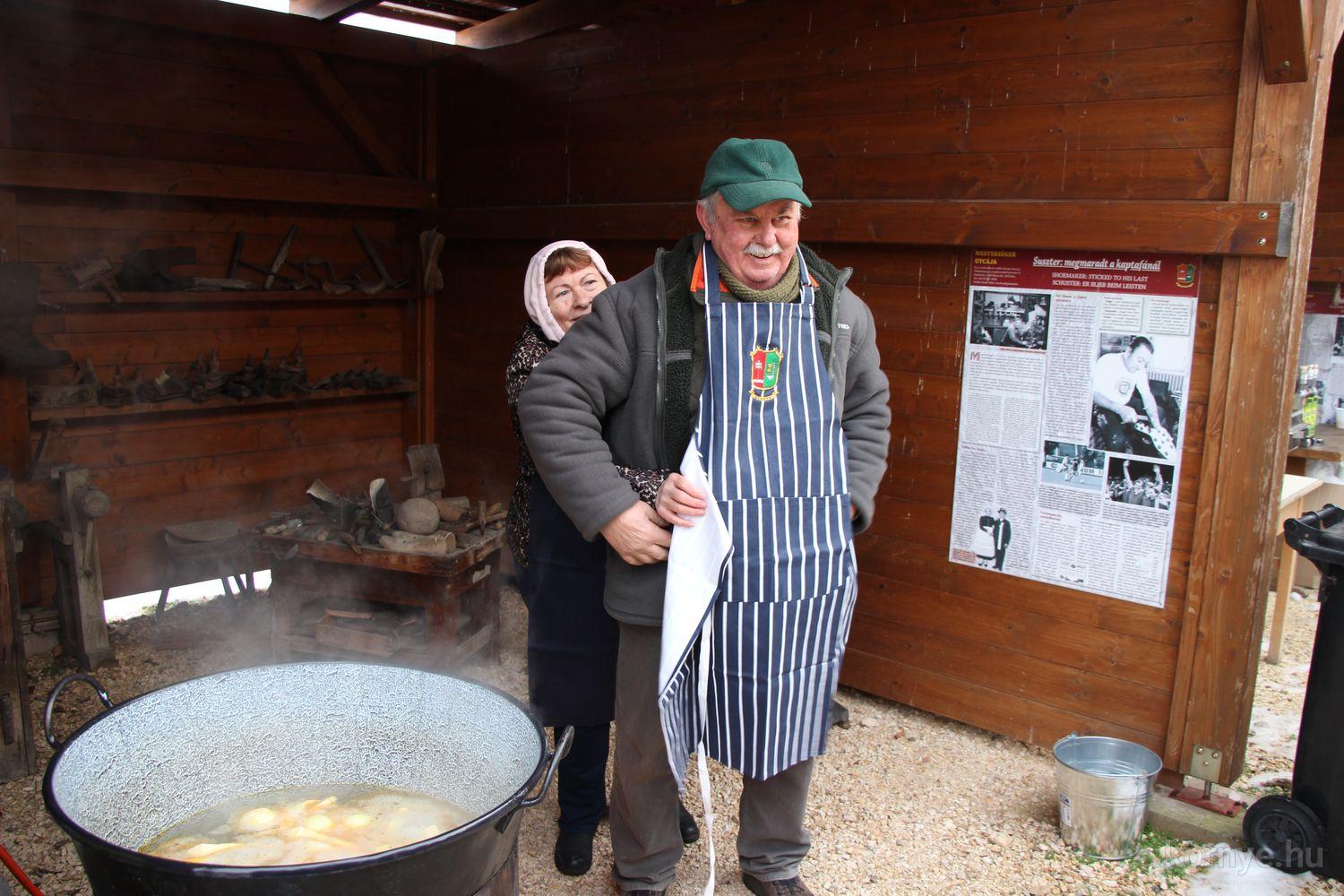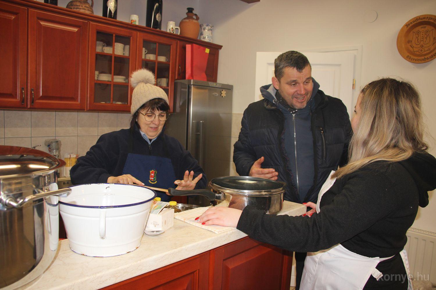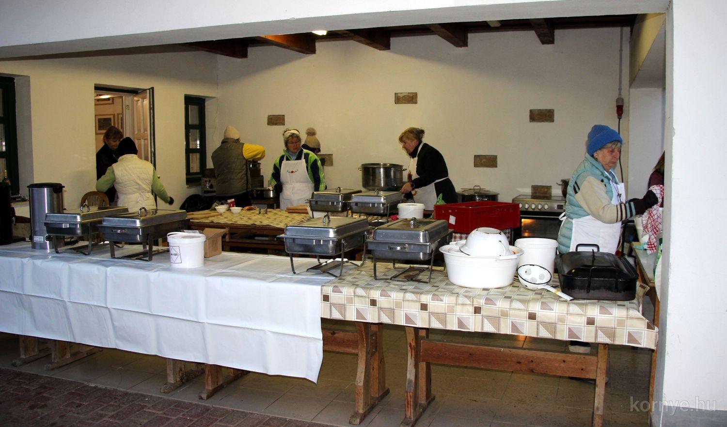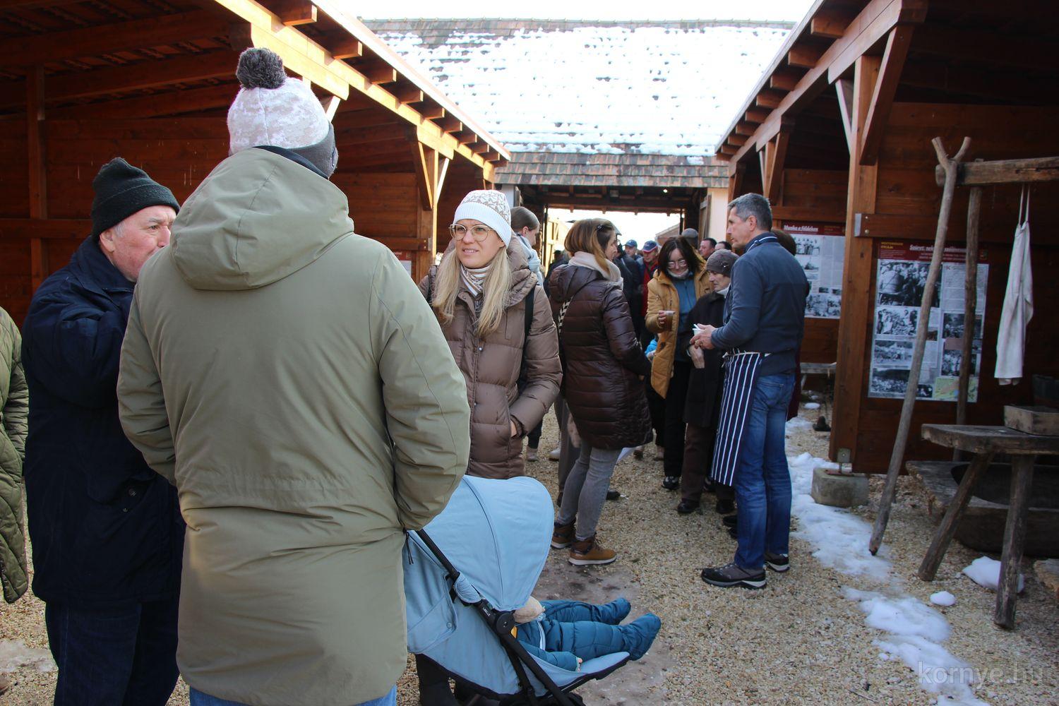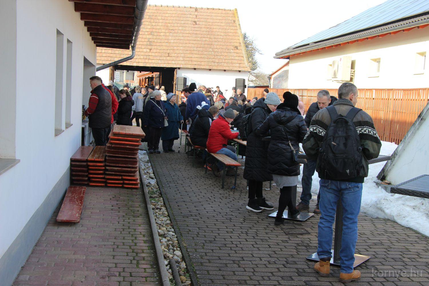 Mindeközben szorgoskodtak az asszonyok, akik már előző nap sütöttek: hájas lekvárost, töpörtyűs pogácsát, sörkiflit, kínáltak, s ahogy az lenni szokott, dolgoztak a férfikéz alá, készítették elő az alapanyagokat a majdani ízletes, sváb hagyományok szerinti disznótoros falatokhoz, melynek hírére 11 órától folyamatosan „telt házasnak” bizonyult a tájház udvara.