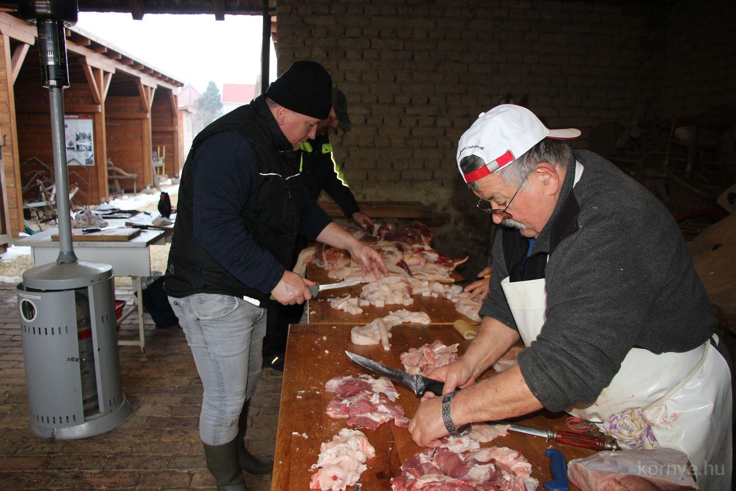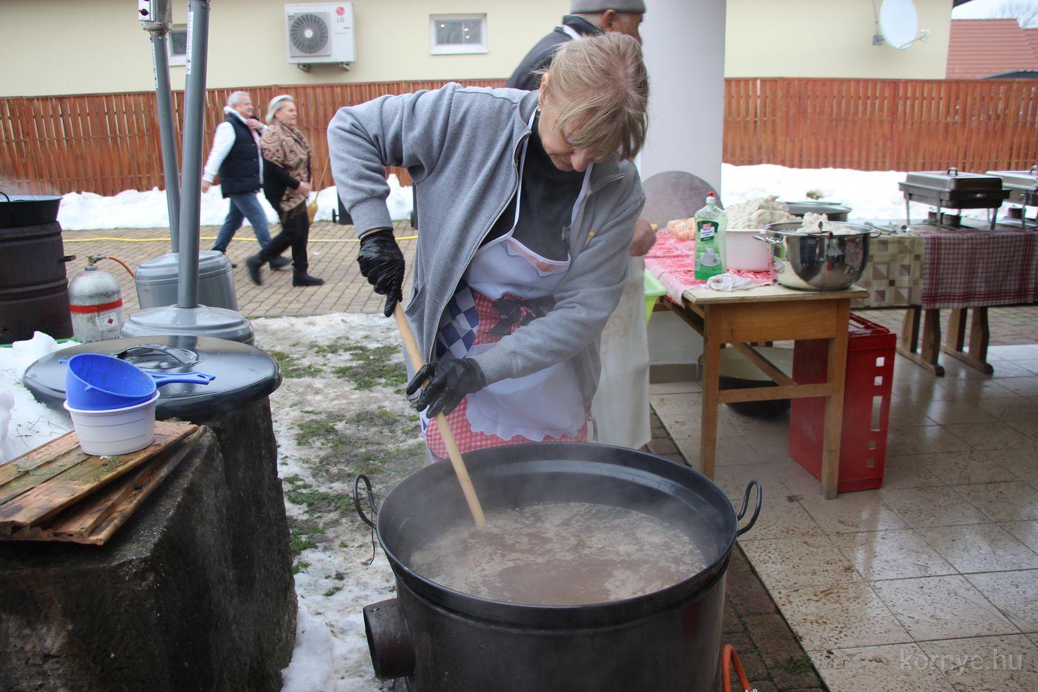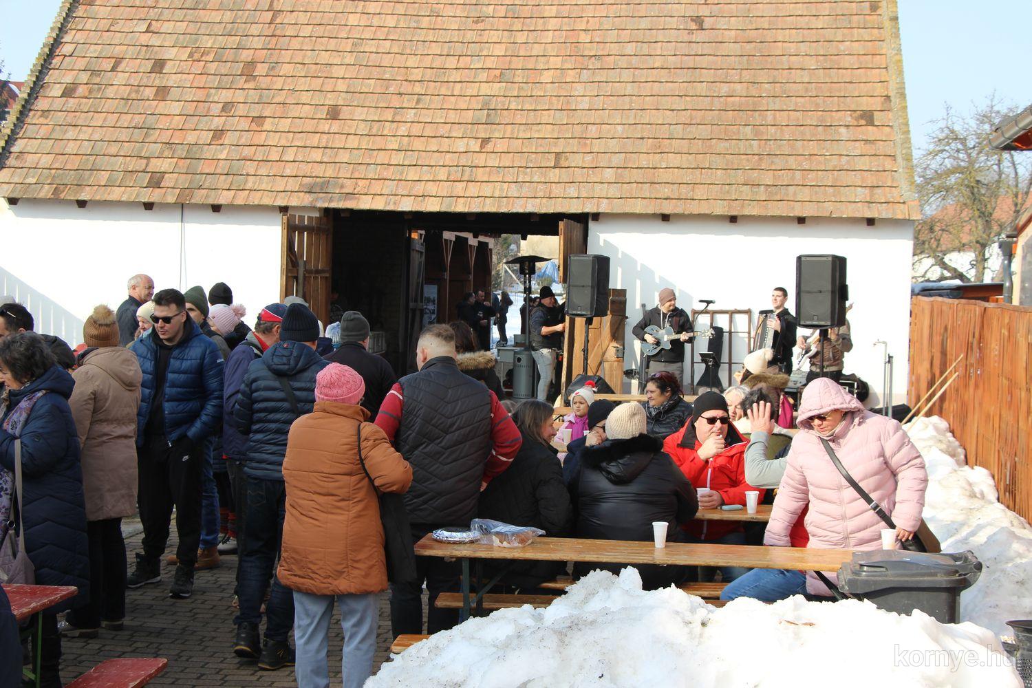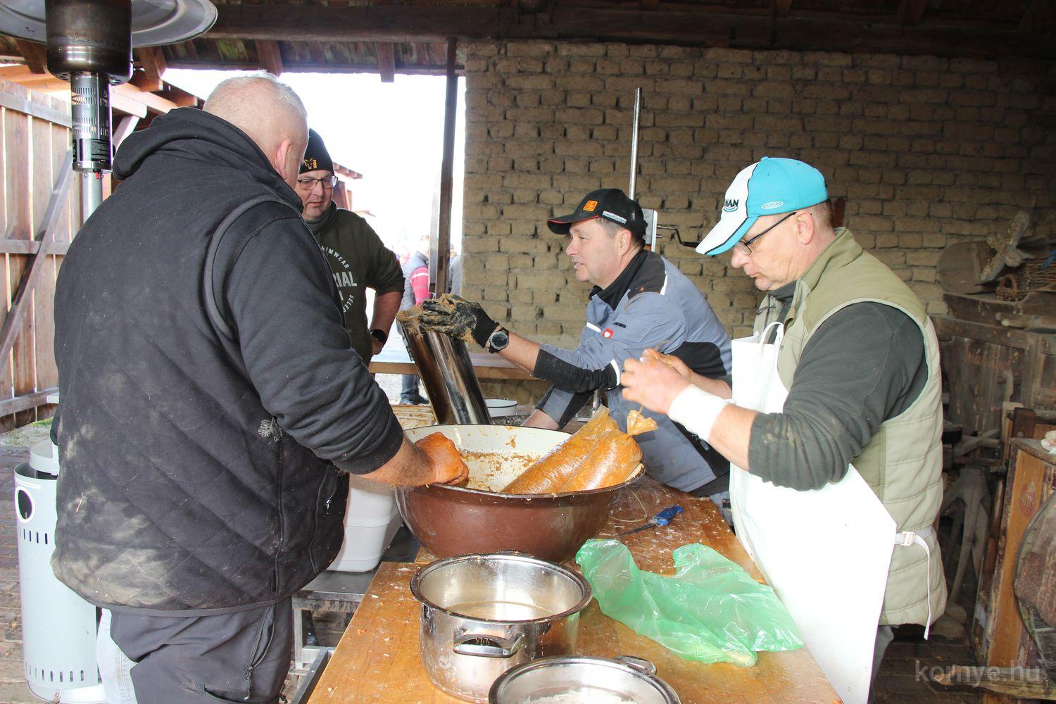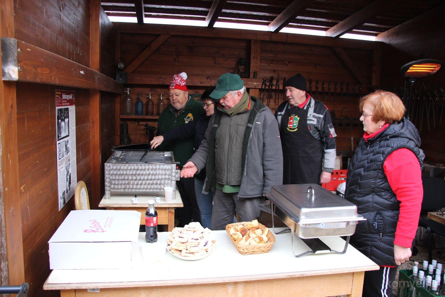Mindeközben szorgoskodtak az asszonyok, akik már előző nap sütöttek: hájas lekvárost, töpörtyűs pogácsát, sörkiflit, kínáltak, s ahogy az lenni szokott, dolgoztak a férfikéz alá, készítették elő az alapanyagokat a majdani ízletes, sváb hagyományok szerinti disznótoros falatokhoz, melynek hírére 11 órától folyamatosan „telt házasnak” bizonyult a tájház udvara.