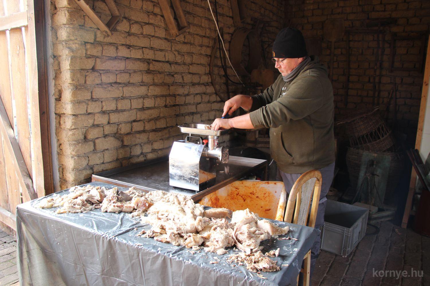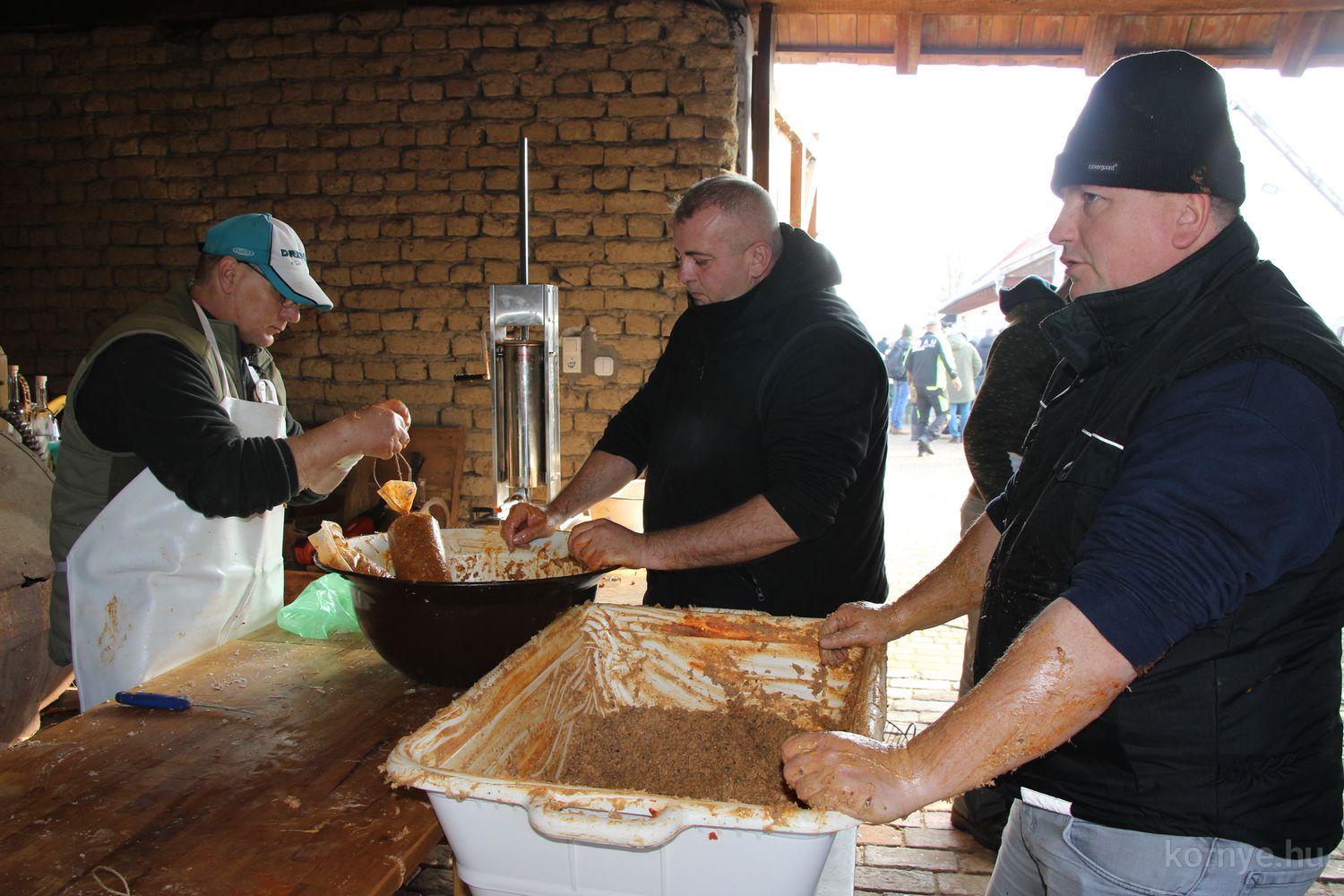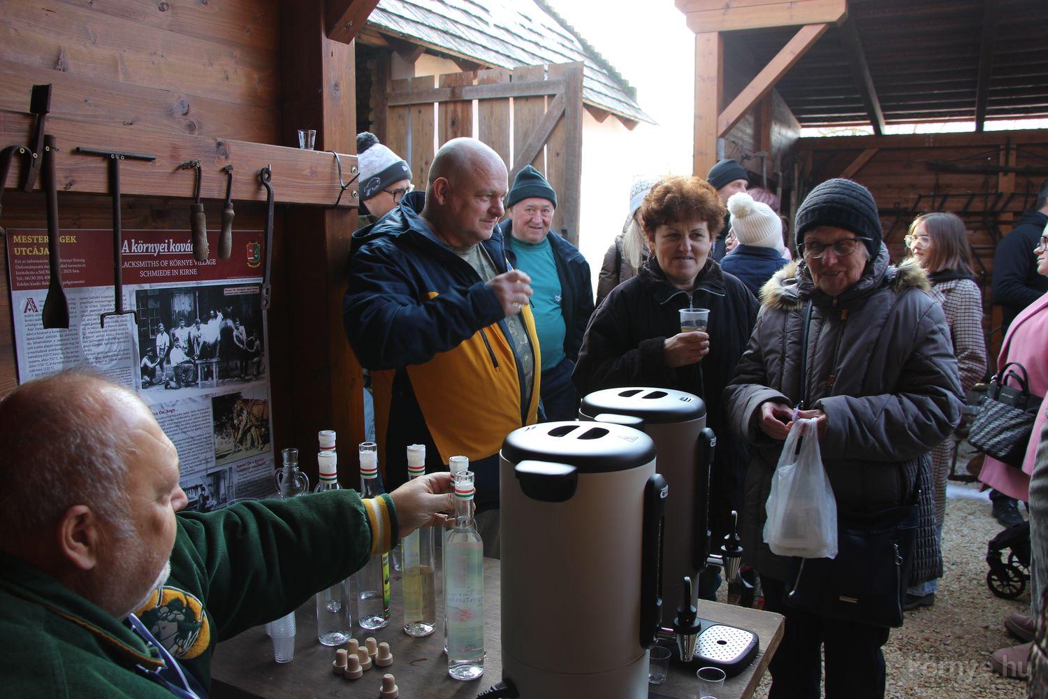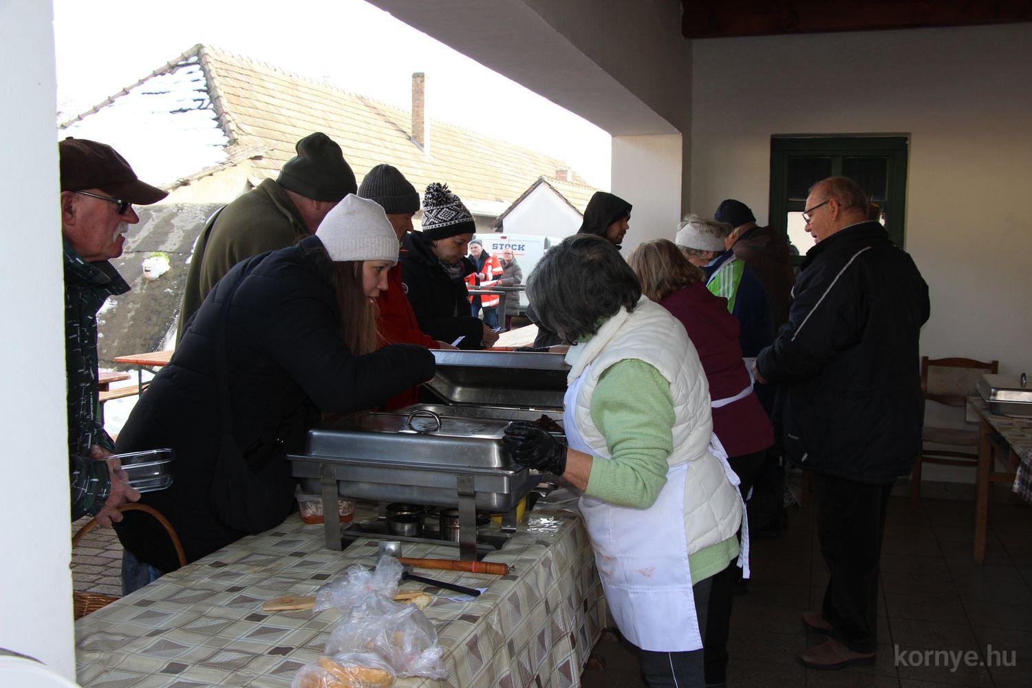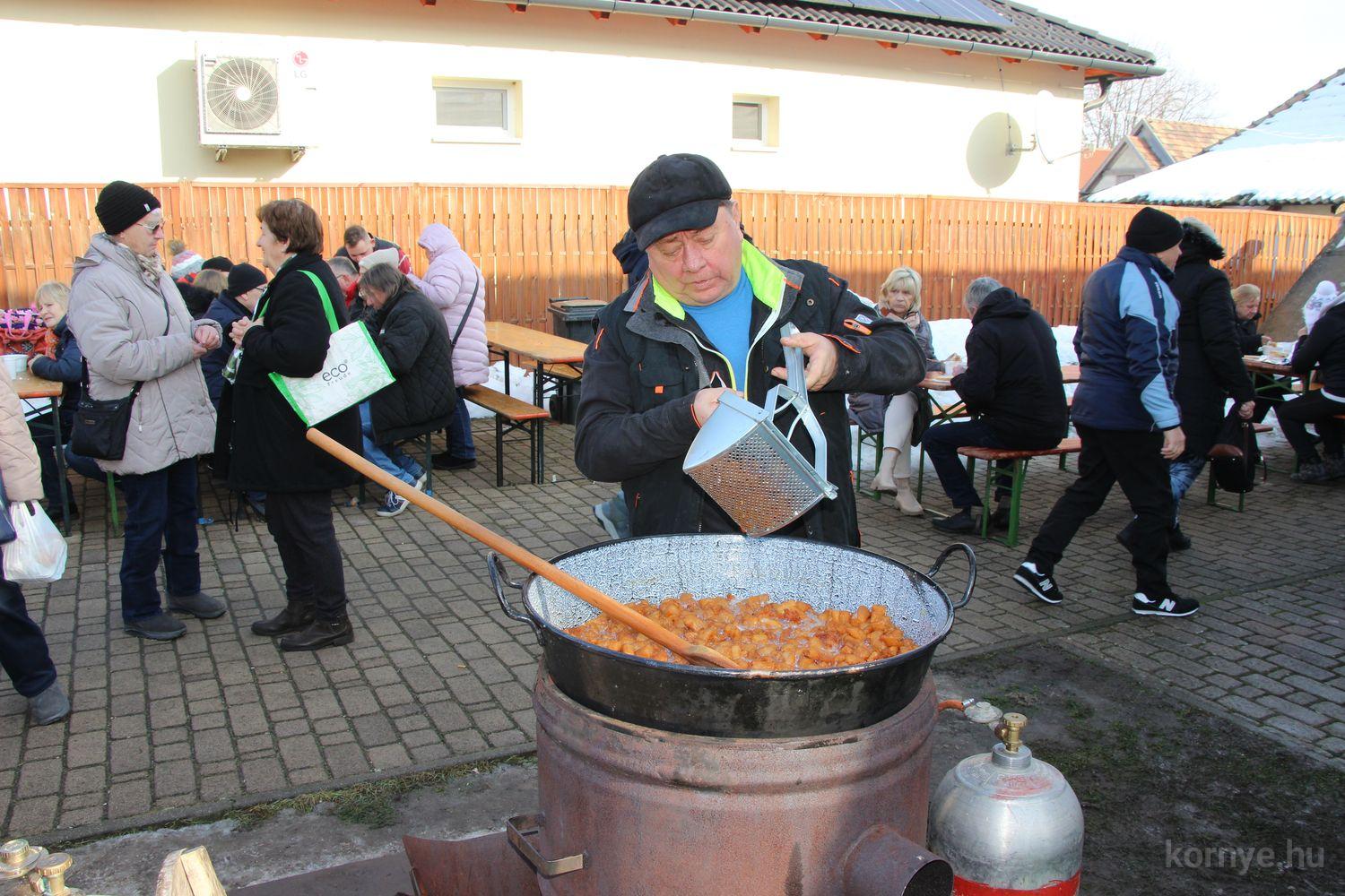 Mindeközben szorgoskodtak az asszonyok, akik már előző nap sütöttek: hájas lekvárost, töpörtyűs pogácsát, sörkiflit, kínáltak, s ahogy az lenni szokott, dolgoztak a férfikéz alá, készítették elő az alapanyagokat a majdani ízletes, sváb hagyományok szerinti disznótoros falatokhoz, melynek hírére 11 órától folyamatosan „telt házasnak” bizonyult a tájház udvara.
