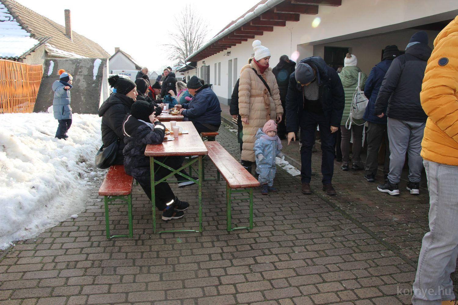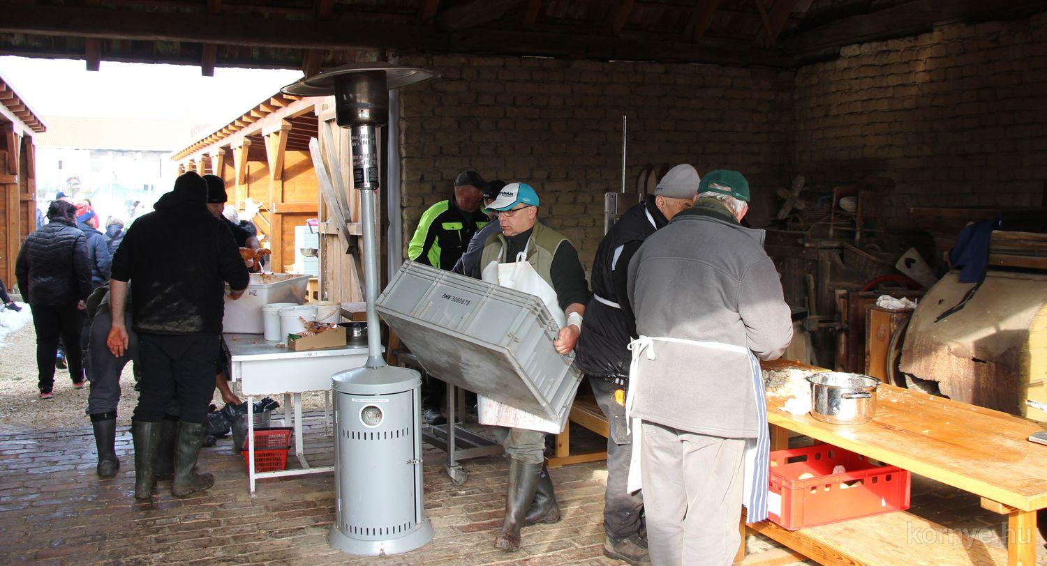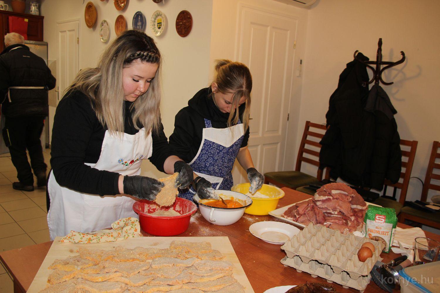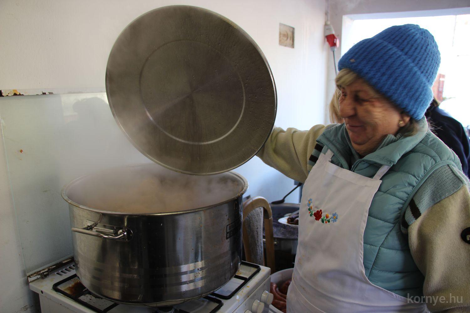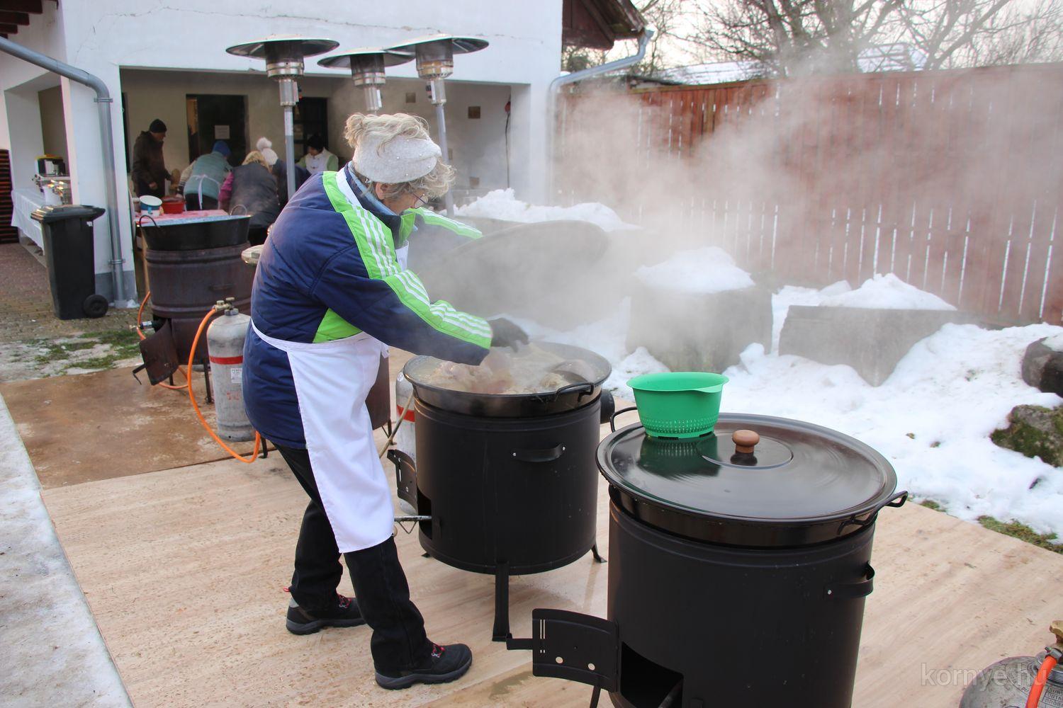 Mindeközben szorgoskodtak az asszonyok, akik már előző nap sütöttek: hájas lekvárost, töpörtyűs pogácsát, sörkiflit, kínáltak, s ahogy az lenni szokott, dolgoztak a férfikéz alá, készítették elő az alapanyagokat a majdani ízletes, sváb hagyományok szerinti disznótoros falatokhoz, melynek hírére 11 órától folyamatosan „telt házasnak” bizonyult a tájház udvara.