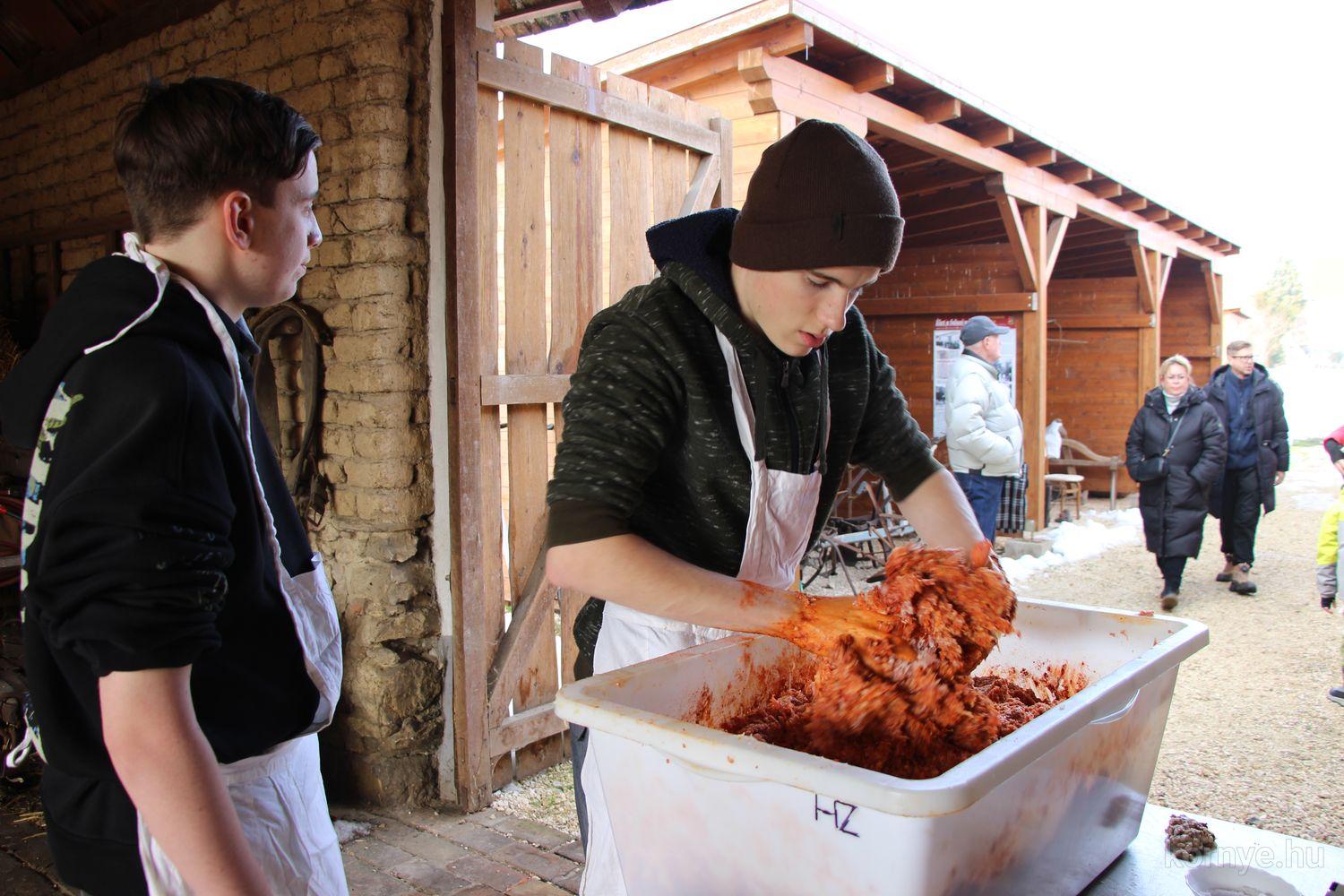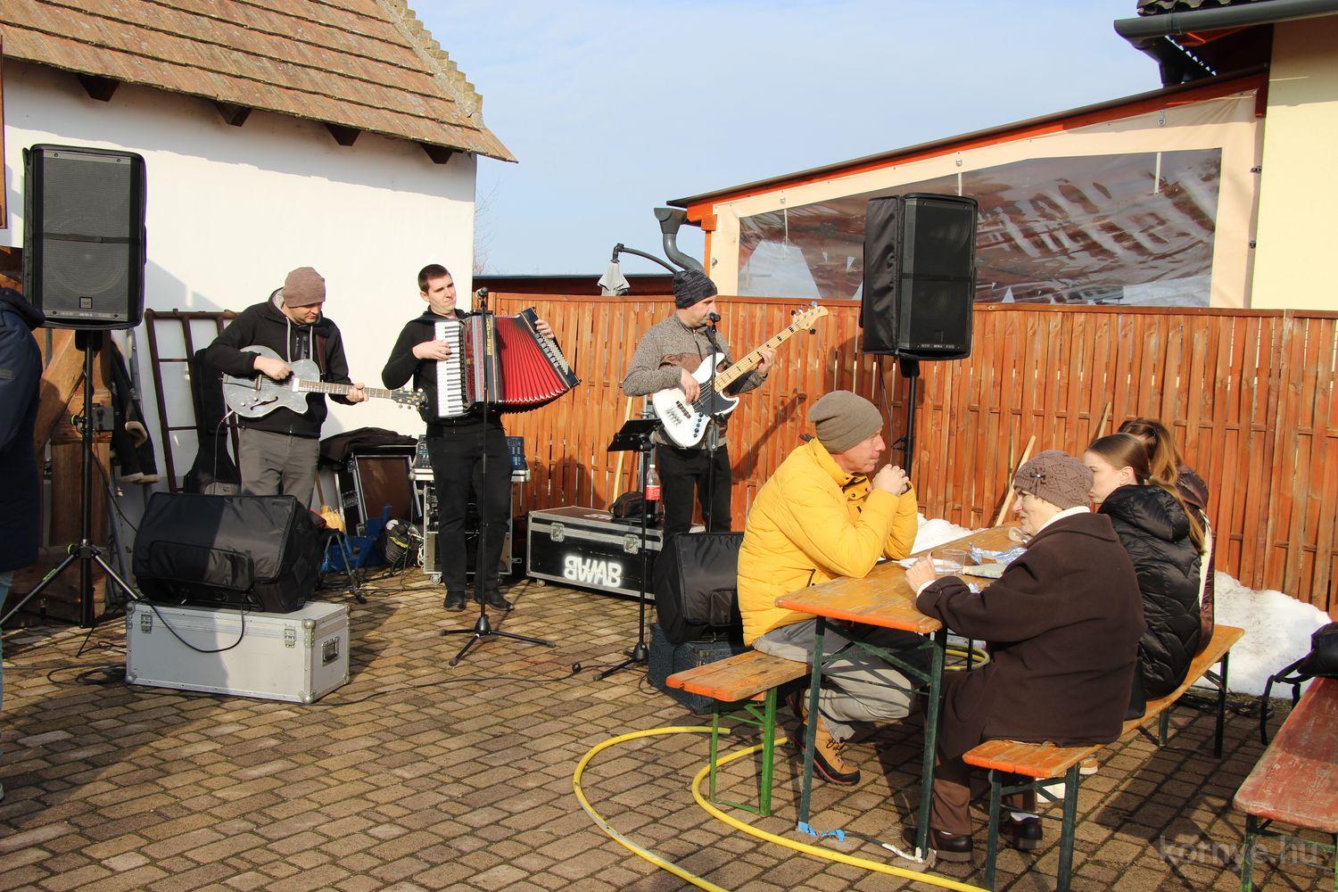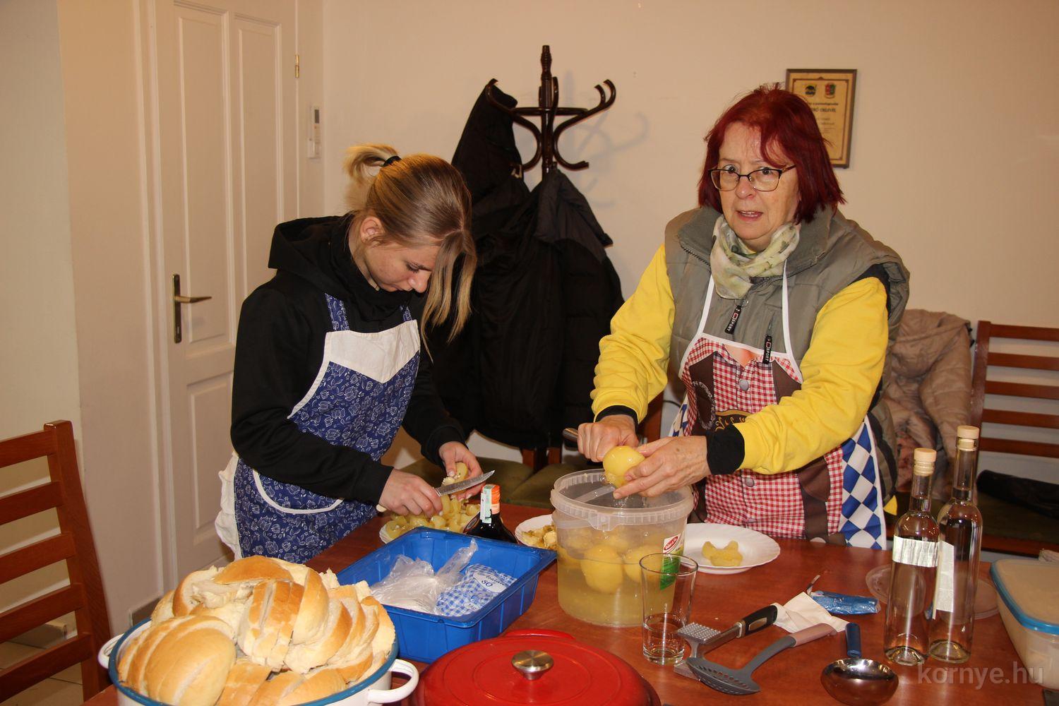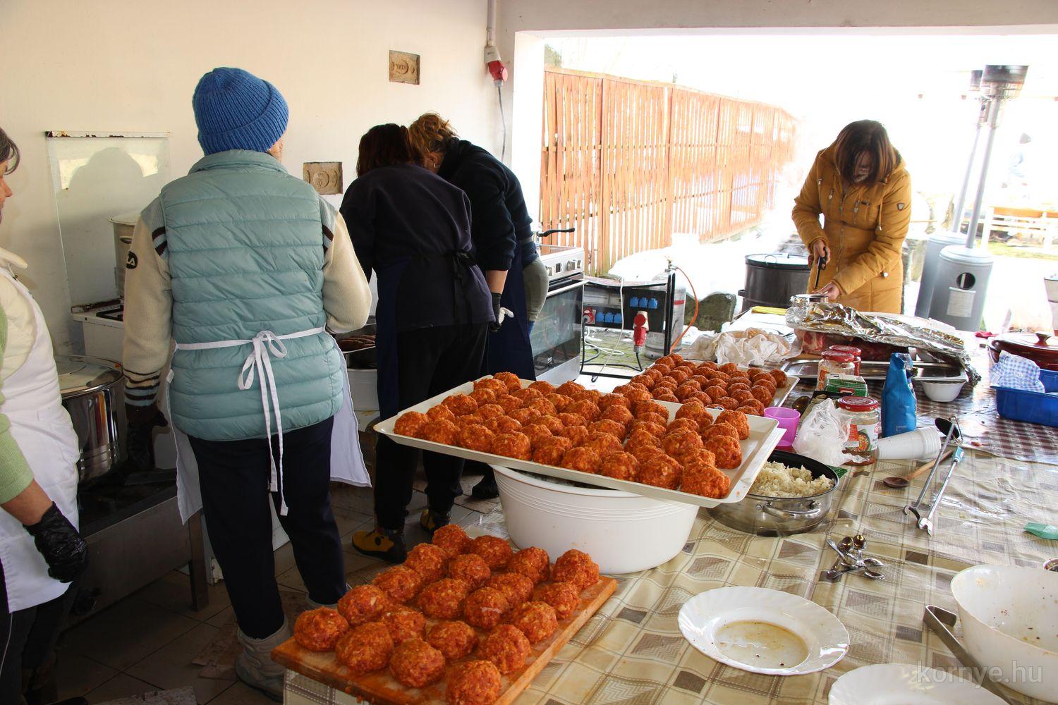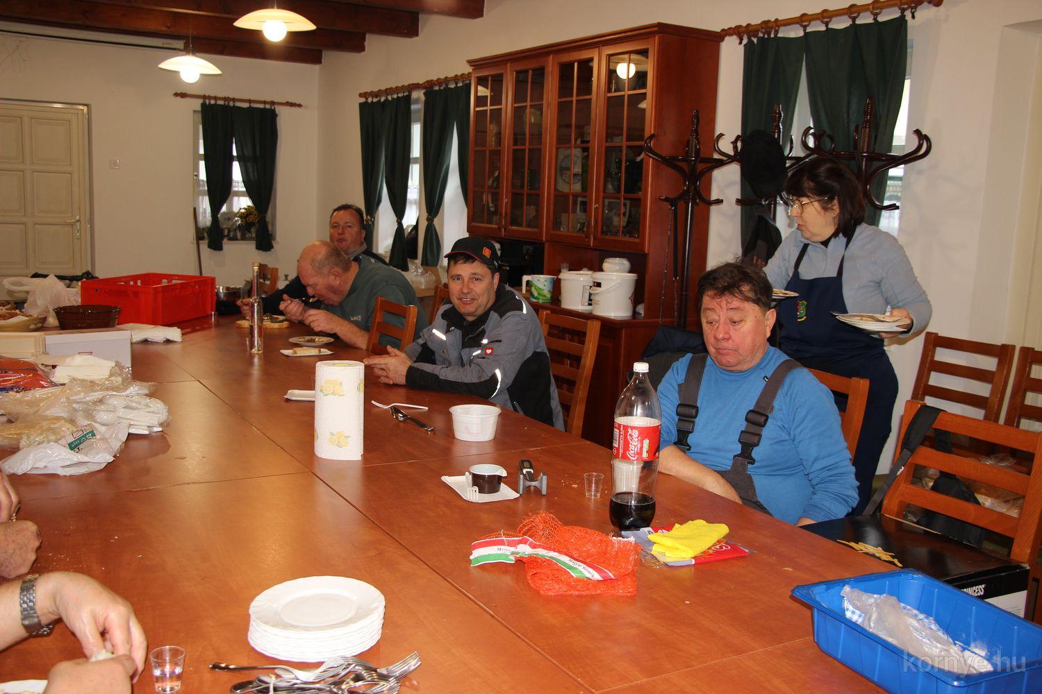 Mindeközben szorgoskodtak az asszonyok, akik már előző nap sütöttek: hájas lekvárost, töpörtyűs pogácsát, sörkiflit, kínáltak, s ahogy az lenni szokott, dolgoztak a férfikéz alá, készítették elő az alapanyagokat a majdani ízletes, sváb hagyományok szerinti disznótoros falatokhoz, melynek hírére 11 órától folyamatosan „telt házasnak” bizonyult a tájház udvara.