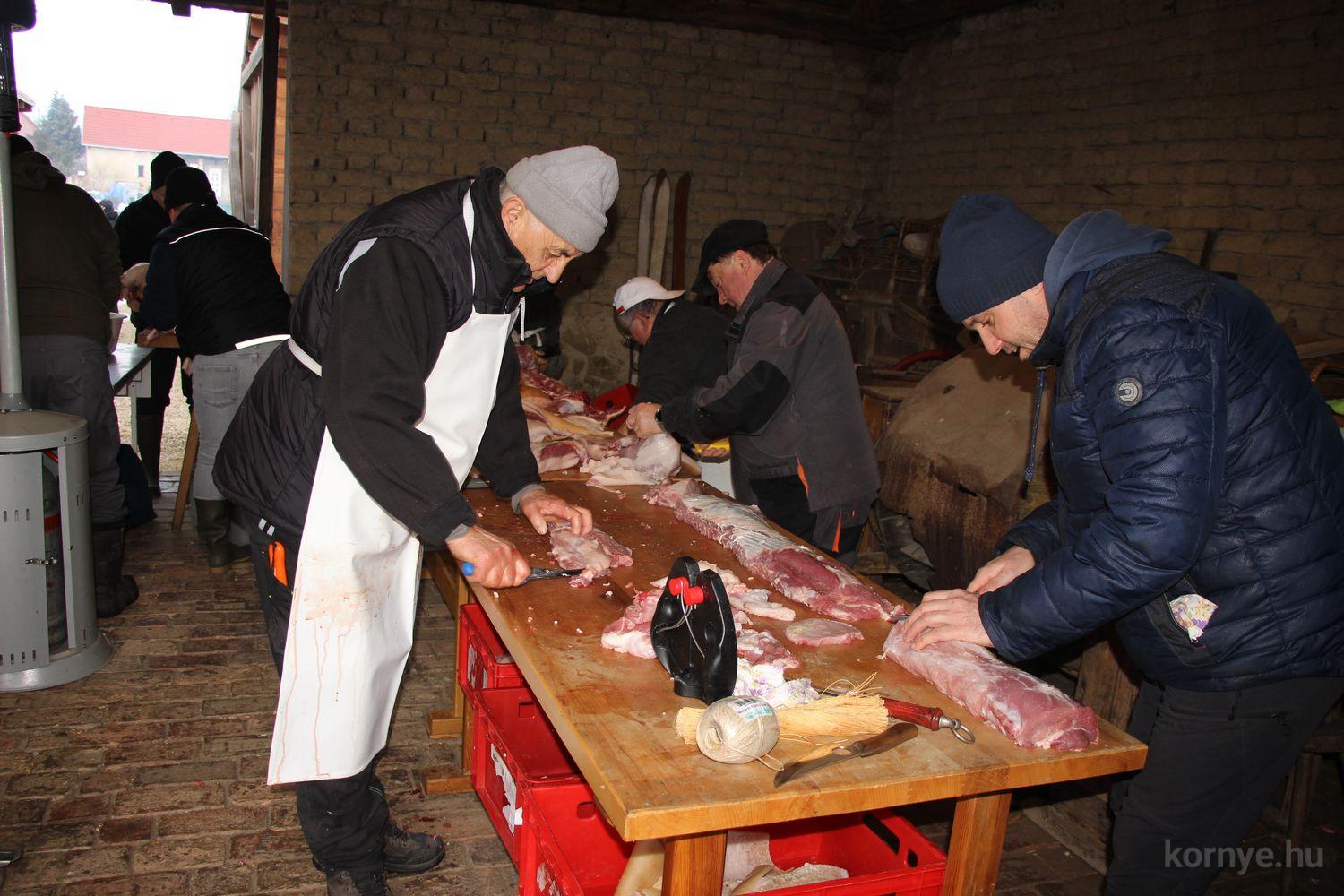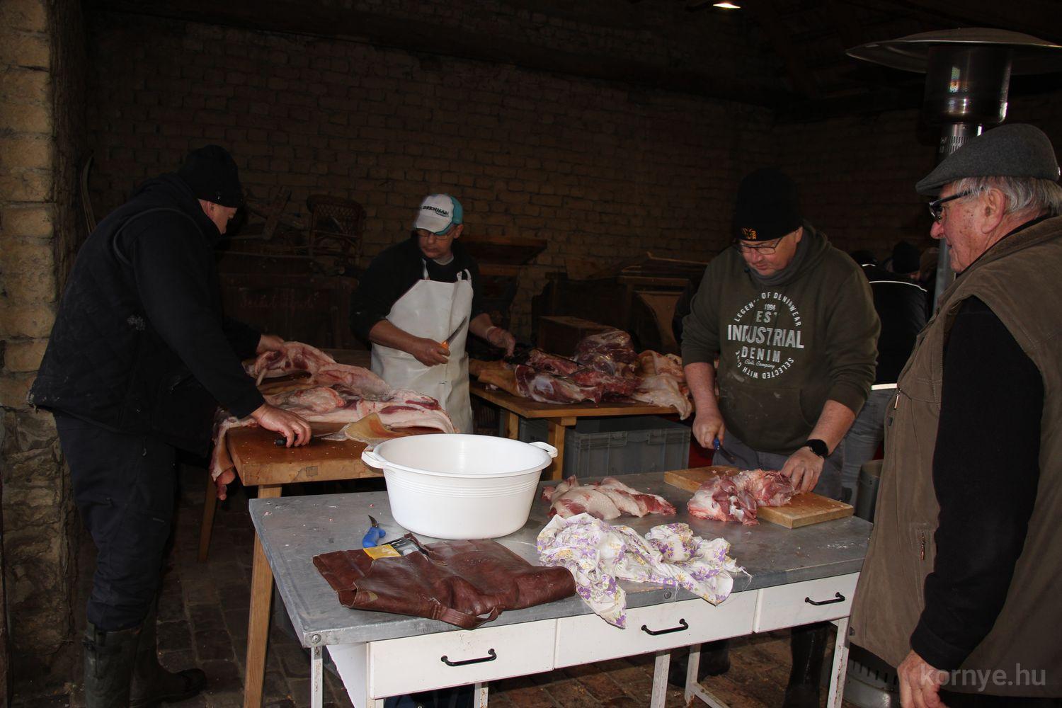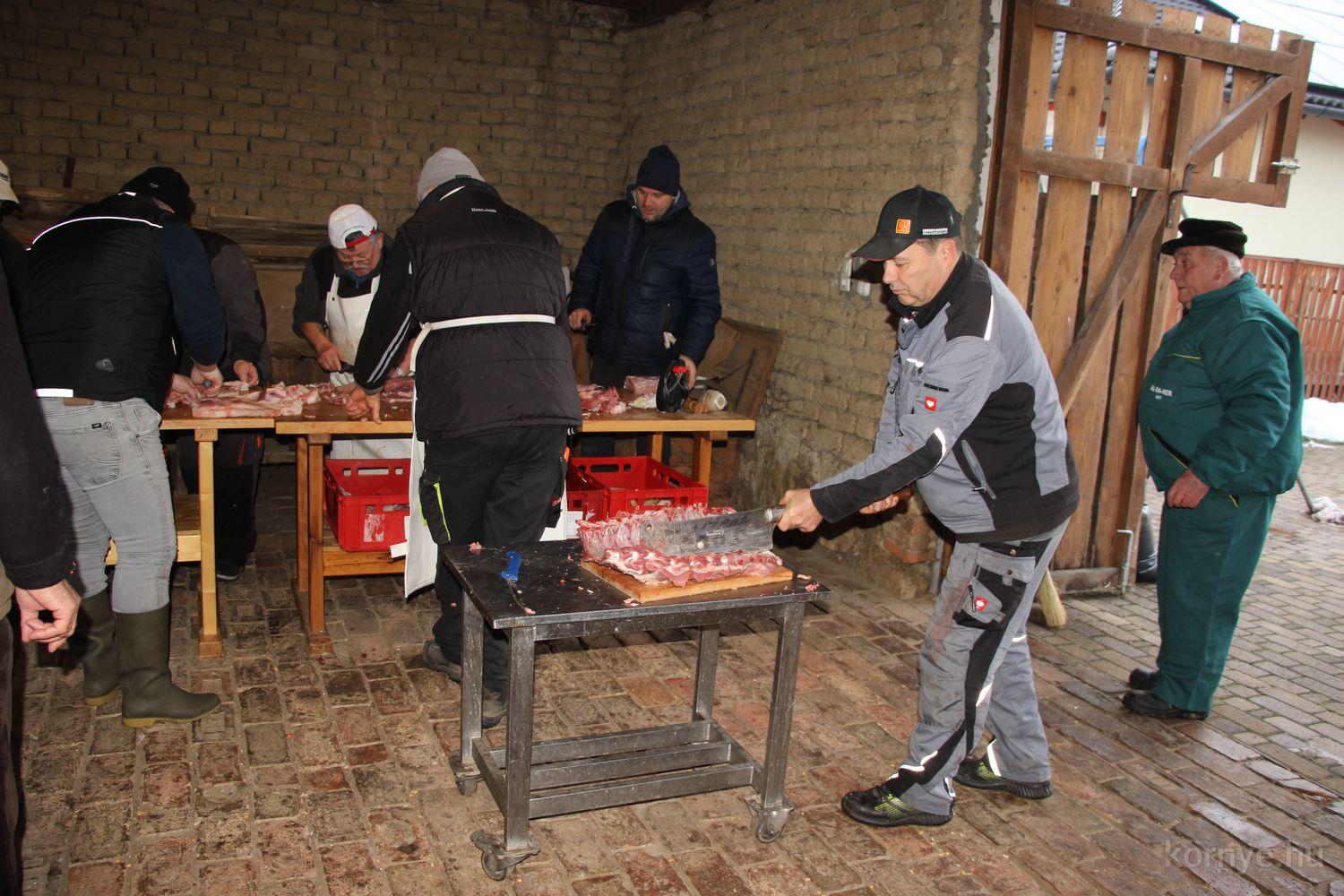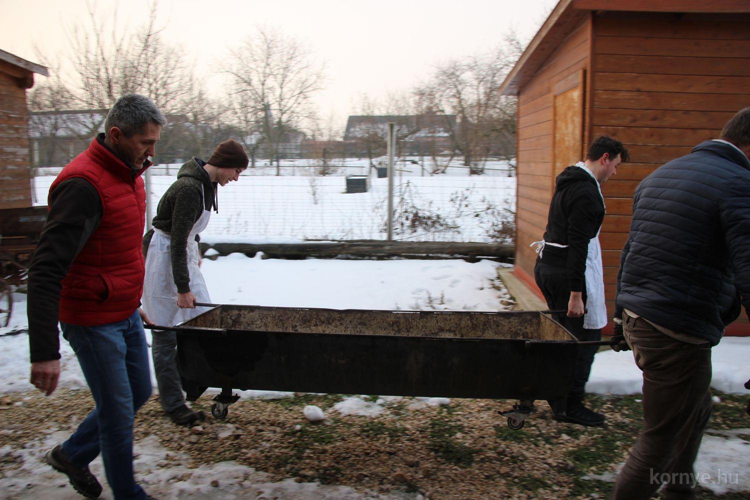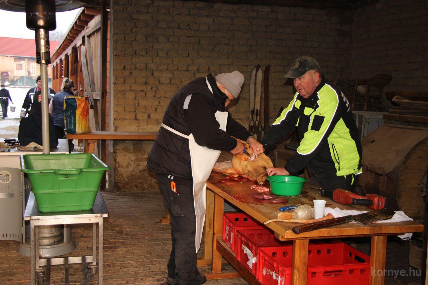 A Közösségi és Tájház udvarára hat óra körül érkezett meg az összességében 480 kilót nyomó két disznó. A kicsivel korábban megszúrt jószágokat sváb hagyományok szerint előbb forrázták, majd levakarták a szőrét, utána következett a perzselés, „mosdatás” és a végső tisztázás kefével, majd rémfára húzták, és hasították ketté.