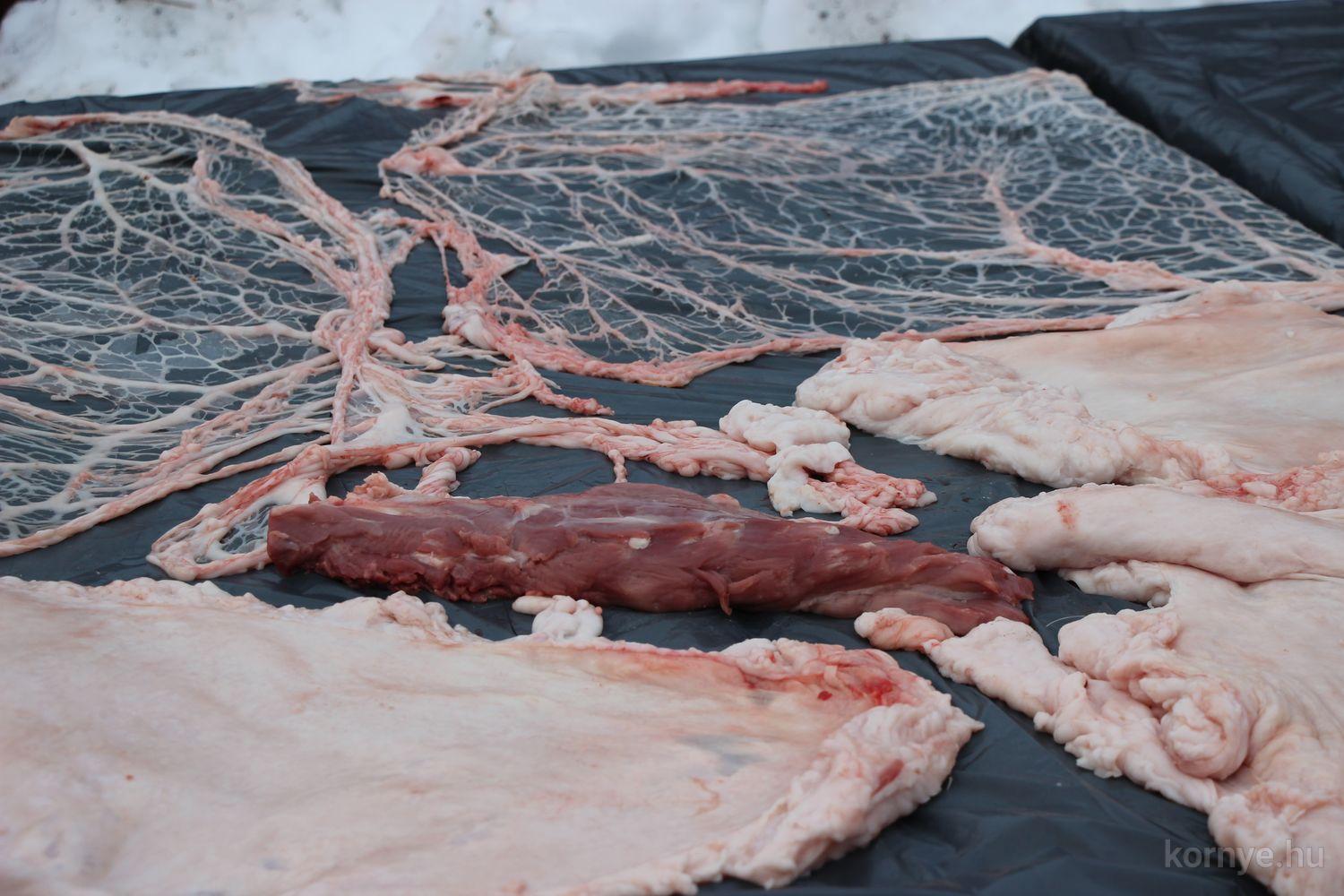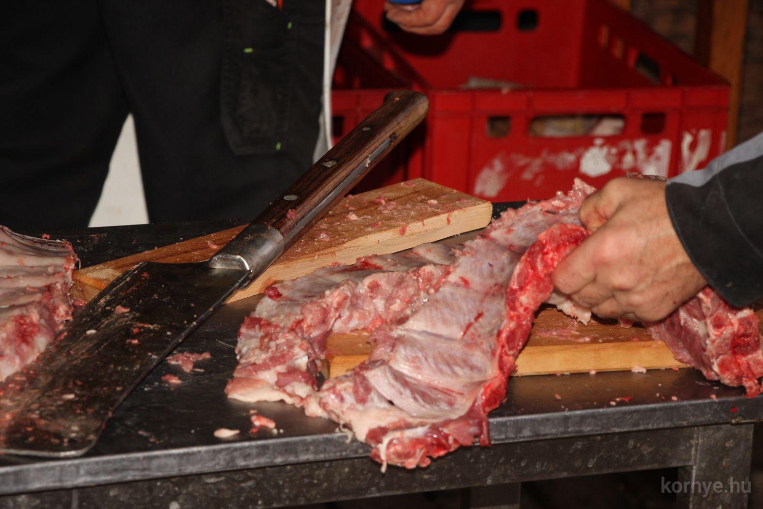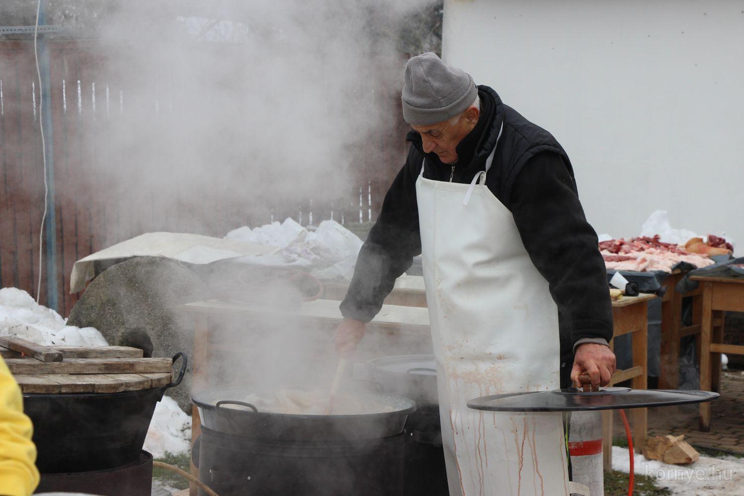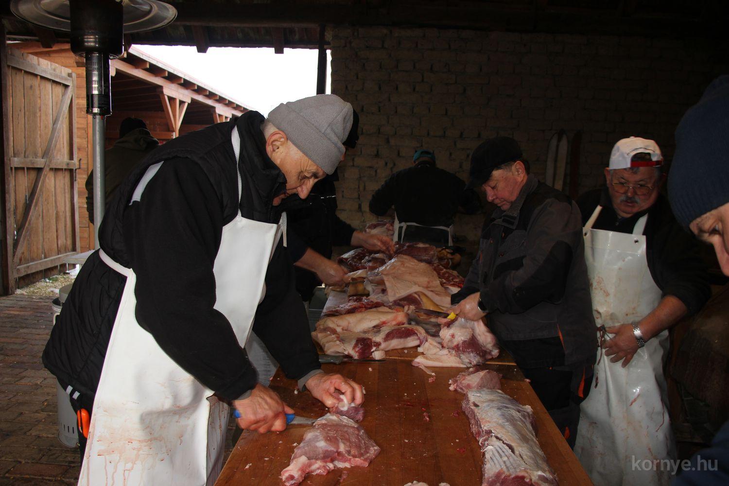 A Közösségi és Tájház udvarára hat óra körül érkezett meg az összességében 480 kilót nyomó két disznó. A kicsivel korábban megszúrt jószágokat sváb hagyományok szerint előbb forrázták, majd levakarták a szőrét, utána következett a perzselés, „mosdatás” és a végső tisztázás kefével, majd rémfára húzták, és hasították ketté.