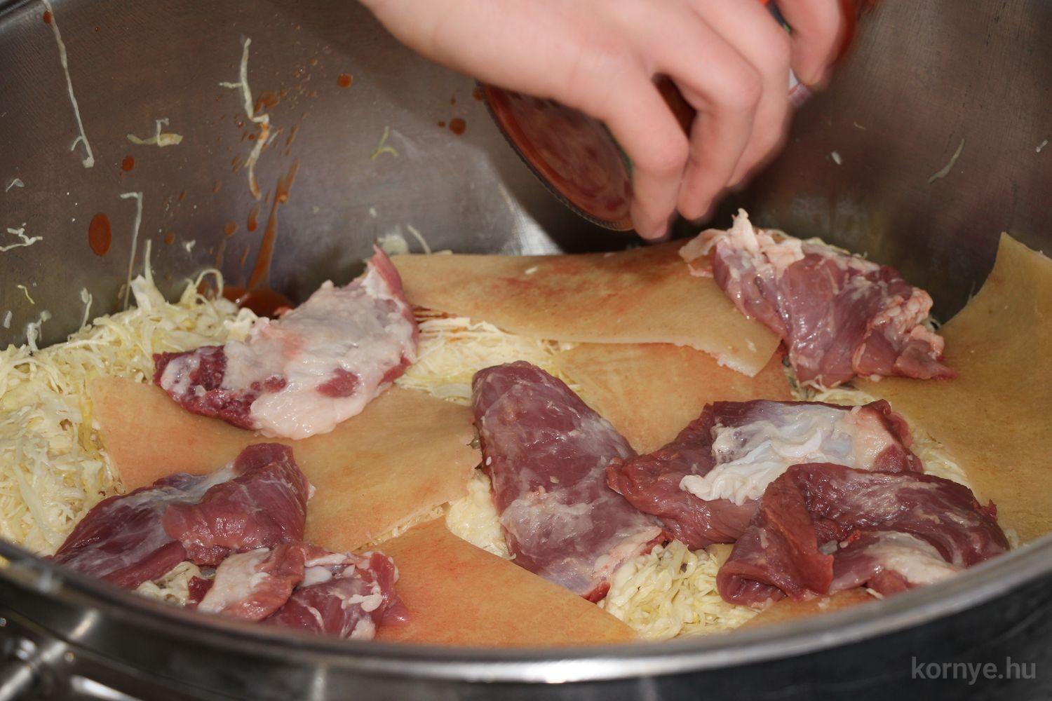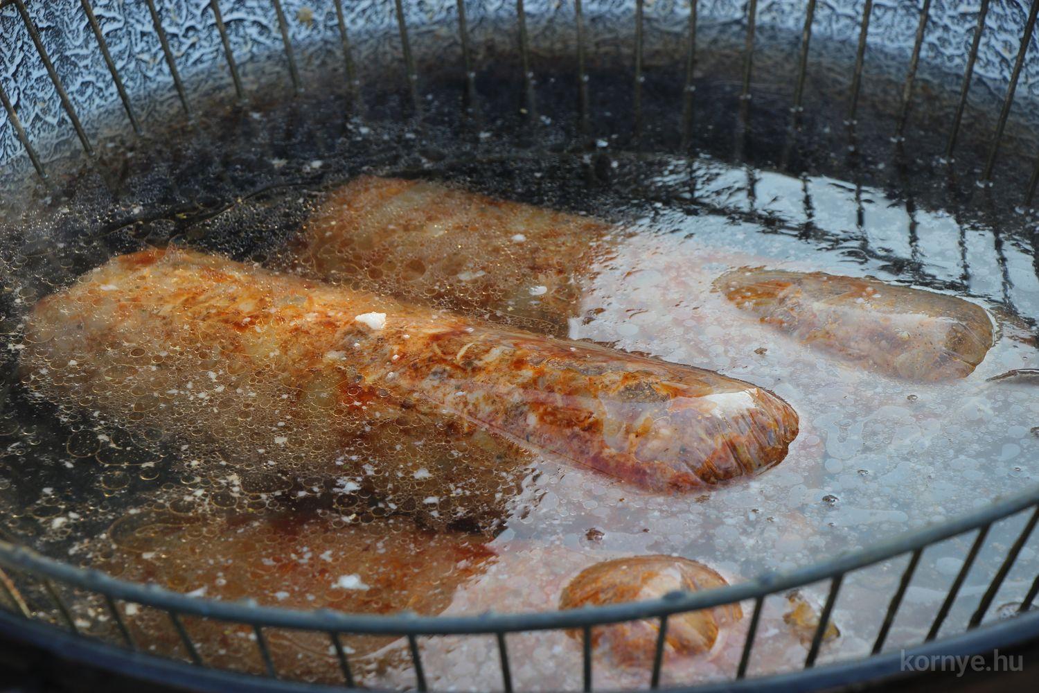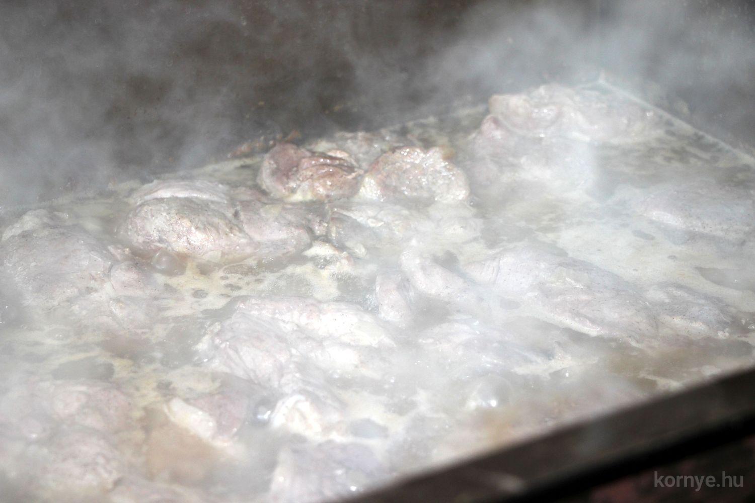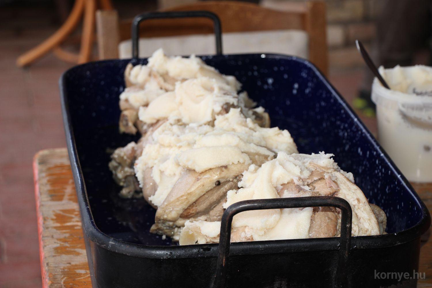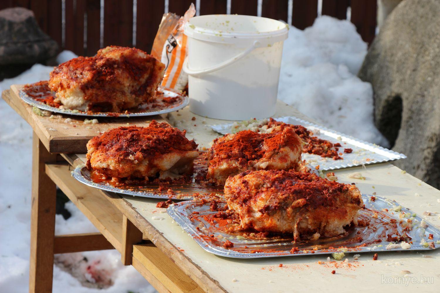 A Közösségi és Tájház udvarára hat óra körül érkezett meg az összességében 480 kilót nyomó két disznó. A kicsivel korábban megszúrt jószágokat sváb hagyományok szerint előbb forrázták, majd levakarták a szőrét, utána következett a perzselés, „mosdatás” és a végső tisztázás kefével, majd rémfára húzták, és hasították ketté.