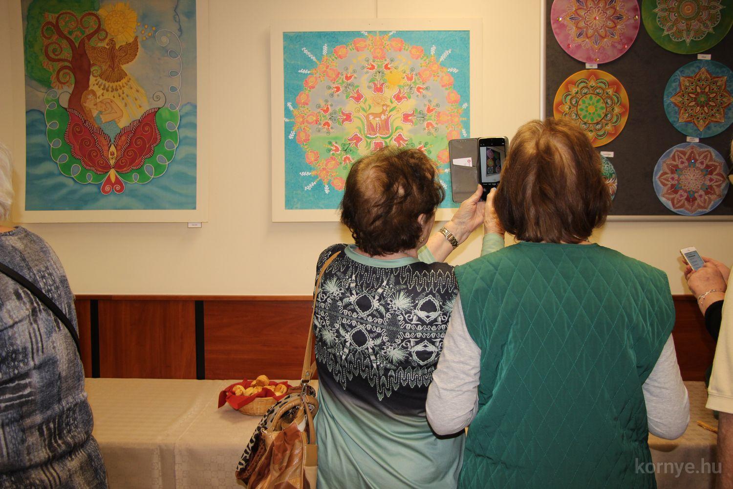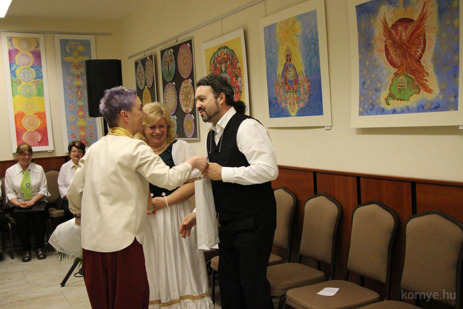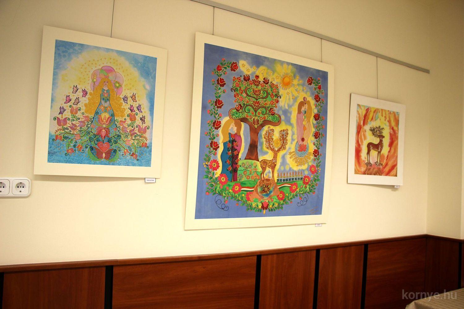 Lélekgyógyász és selyemfestő. Ez sok mindent elárul. A gyógyító és művészeti tevékenységet is, ami a selyemfestéseknek a megalkotása, legyen szó mandaláról, vagy képekről, amelyek valamit levetítenek, megjelenítenek, árasztanak az emberek felé. Ezekben gyógyító kódok vannak, de hogyan jut el odáig egy ember, hogy ilyeneket készítsen? – tette fel a kérdést az alkotásokat ajánló Szokolai Tibor, majd a választ így osztotta meg a jelenlévőkkel: a Kedvesemnek az 1990-es évek elején volt egy műtéti beavatkozást követő halál közeli élménye, amely során olyan szeretetet, olyan békét, olyan harmóniát tapasztalt meg, amit nem lehet szavakkal kifejezni. Akkor indult el ez a lélek állapotváltozás. Mindig is nagyon jó volt a kézügyessége, korábban mesterfodrászként versenyeket nyert, és elindult egy úton, a fény kiárasztásának az útján. Sokat képezte magát, reiki és agykontroll, angyal tanfolyamokat végzett, táltos iskolába járt, mindezeket azért, hogy a szívét, a lelkét felkészítve még magasabb tudással, még nagyobb alázattal és szeretettel áraszthassa a fényt, Isten fényét. Ezek az alkotások, amelyek 2012-től születtek, az egyediségük, a színviláguk, az ősképek, az őskódok által olyan erővel bírnak, amit szavakkal nem lehet kifejezni, de ha odaáll az ember egy kép elé, akkor megszólítja őt, és áthatja a szívét, a lelkét.